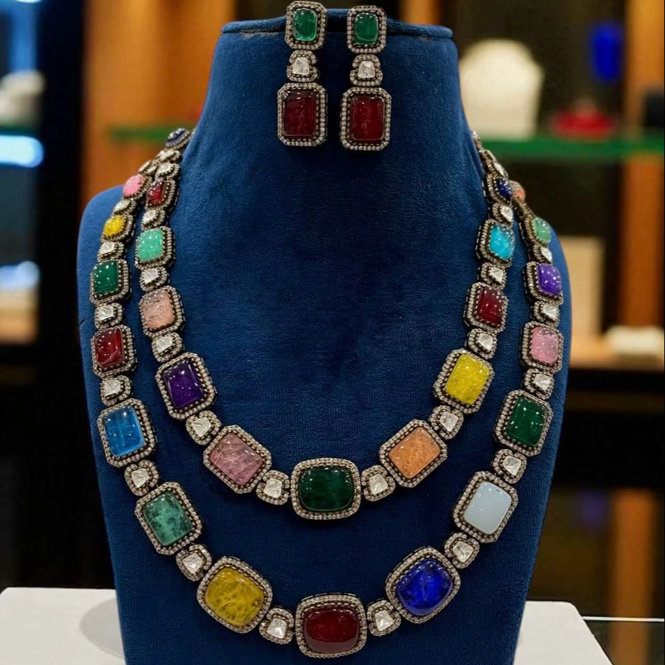 สร้อยคอหินสองชั้นสไตล์วิกตอเรียได้รับความนิยม kundan และหินสีใหญ่สไตล์ navratan Maharani