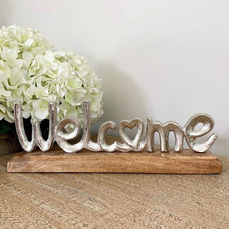 ชุดตกแต่งคำว่า WELCOME กำลังเป็นที่นิยม จำนวน 2 ชิ้น พร้อมรูปหัวใจบนฐานไม้ ตกแต่งด้วยอะลูมิเนียมสีเงิน สำหรับตกแต่งบ้าน ห้องนั่งเล่น
