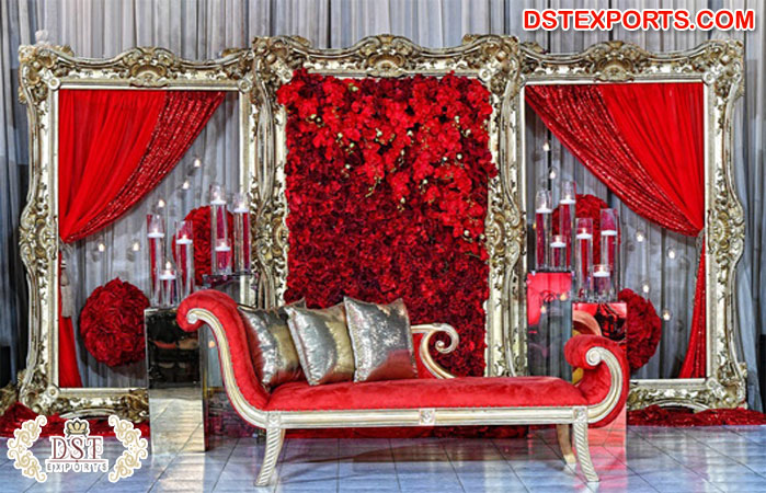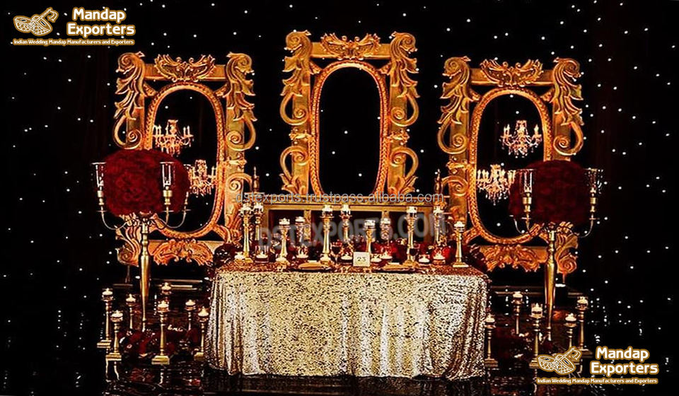 Trending Asian Wedding Stage Decor Golden Paisleys Wedding Reception Stage Backdrop FRP Frames for Events and Ceremonies