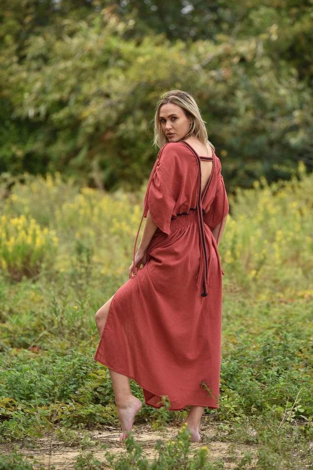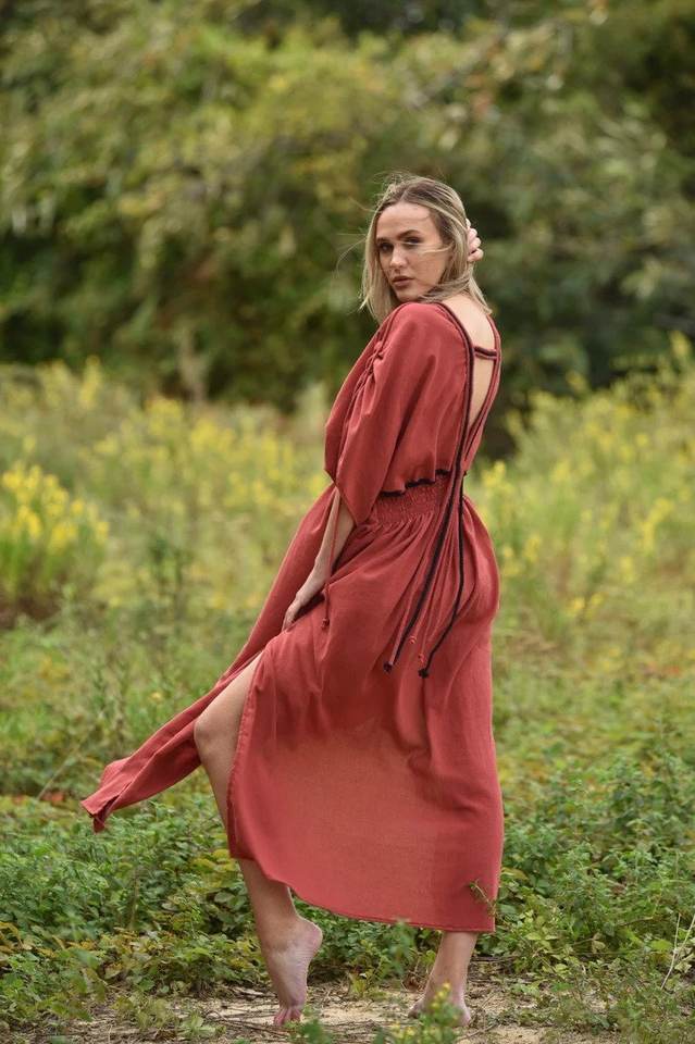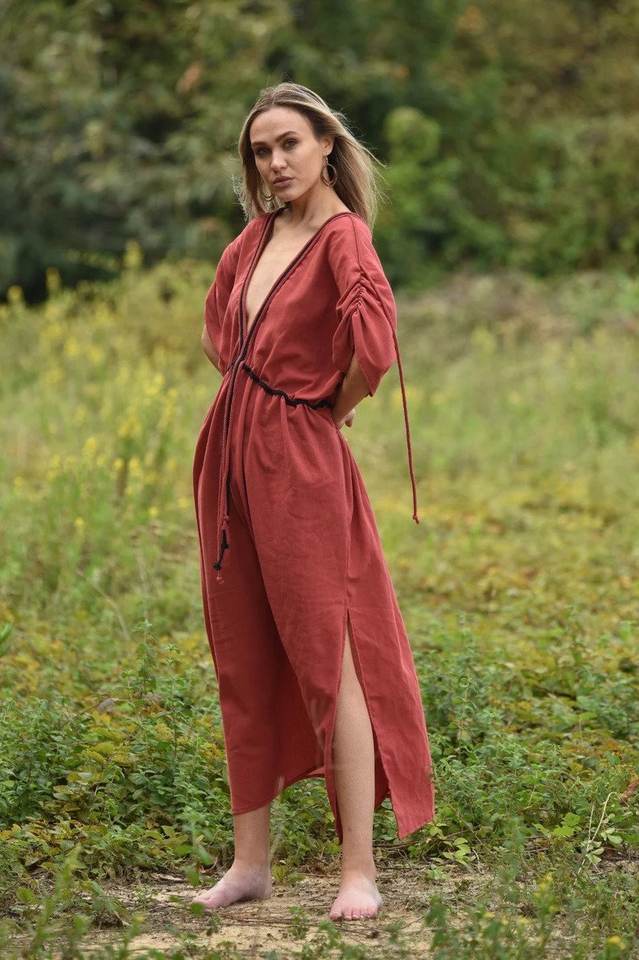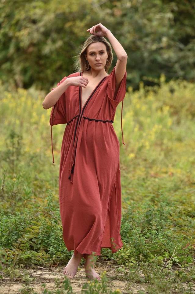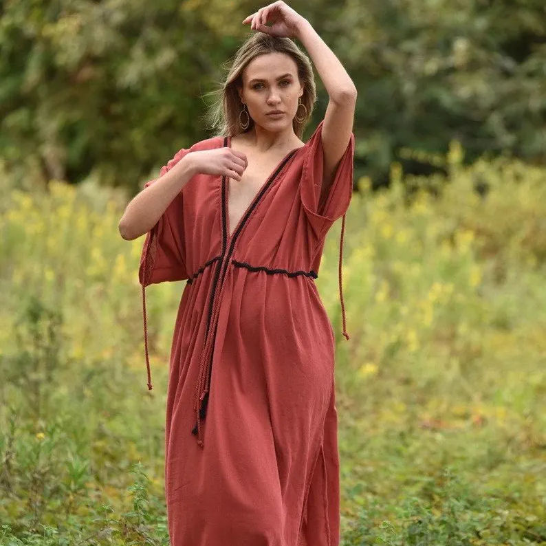 เดรสยาวคลุมท้องคอวีสำหรับผู้หญิงเดรสยาวสไตล์โบฮีเมียนสำหรับคุณแม่ทำจากผ้าฝ้าย