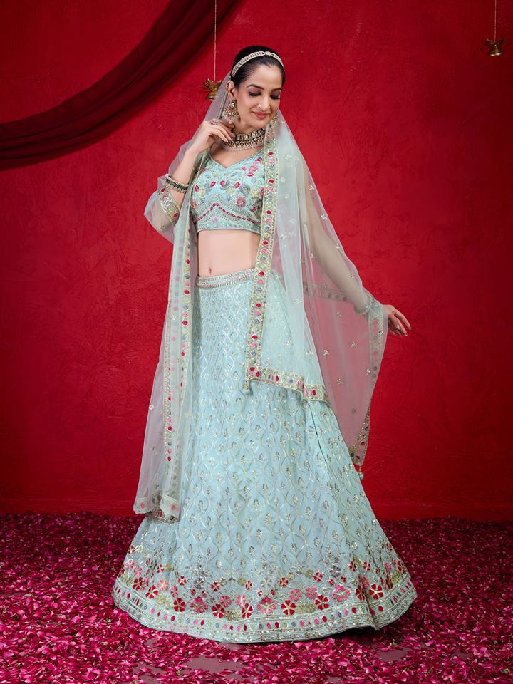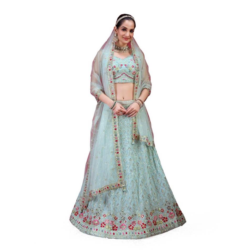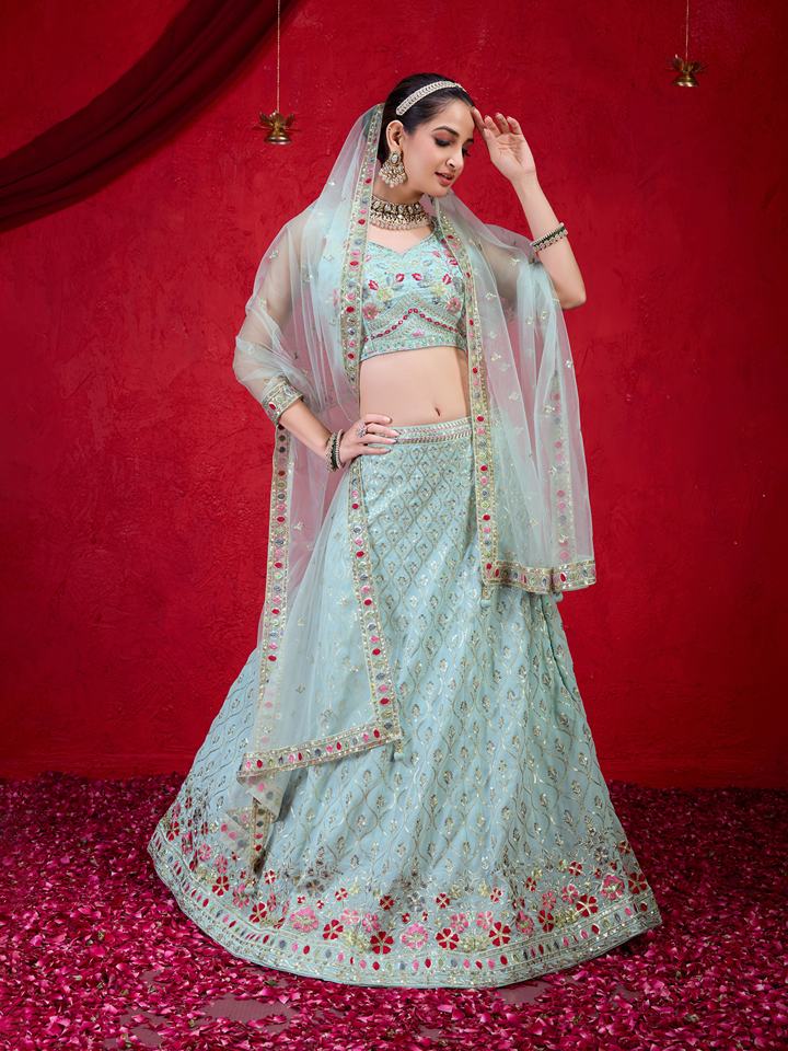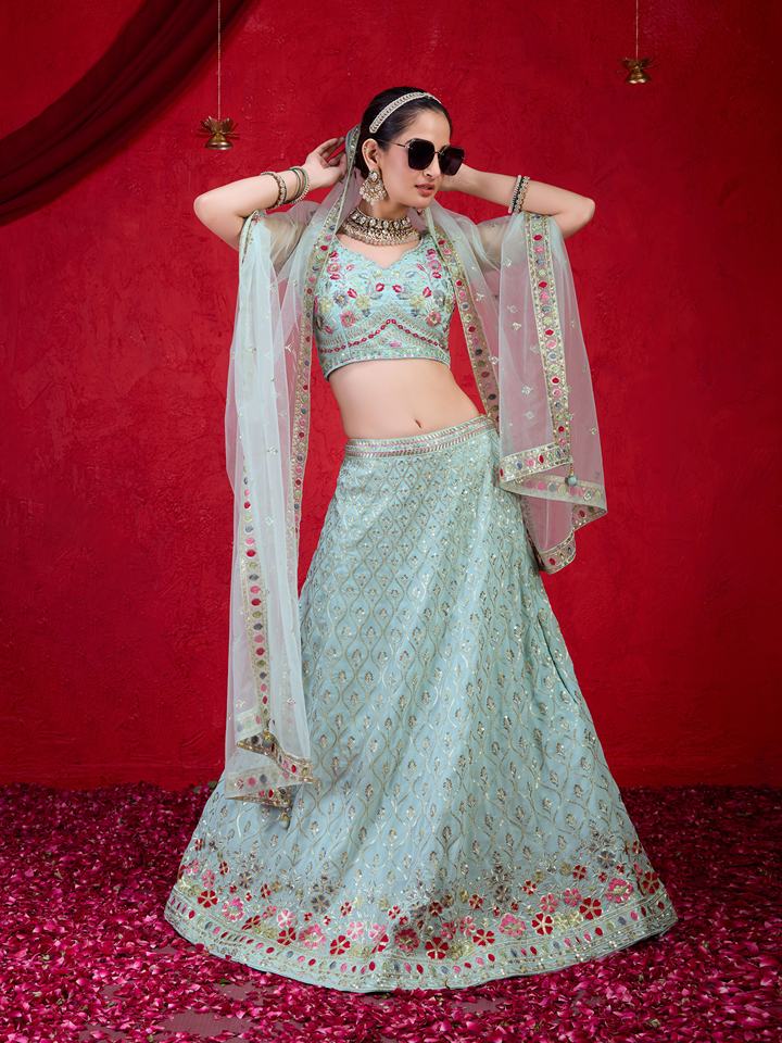 ชุดเลเฮนกาโชลีงานแต่งงานแบบกึ่งสำเร็จรูป คอวี แขนกุด ผ้าจอร์เจตต์สีเขียวอ่อนธรรมชาติ พร้อมผ้าคลุมไหล่ ระบายอากาศได้ดี จากเทรนด์มอลส์