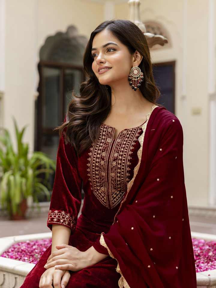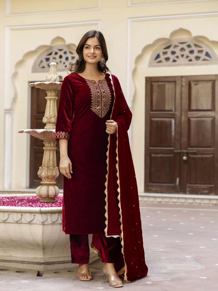 ชุดสูทผ้ากำมะหยี่ปักลายสไตล์ชาติพันธุ์สำหรับผู้หญิง พร้อมผ้าคลุมไหล่ สำหรับงานปาร์ตี้ (G321-สีแดงเลือดหมู)-ทำจากวัสดุรีไซเคิล