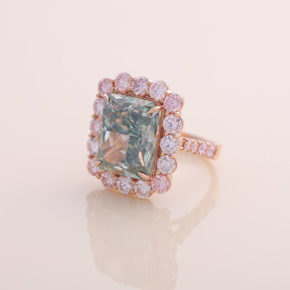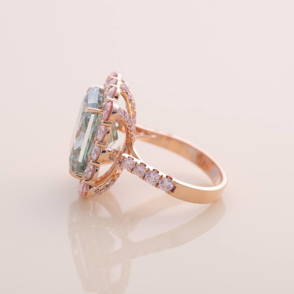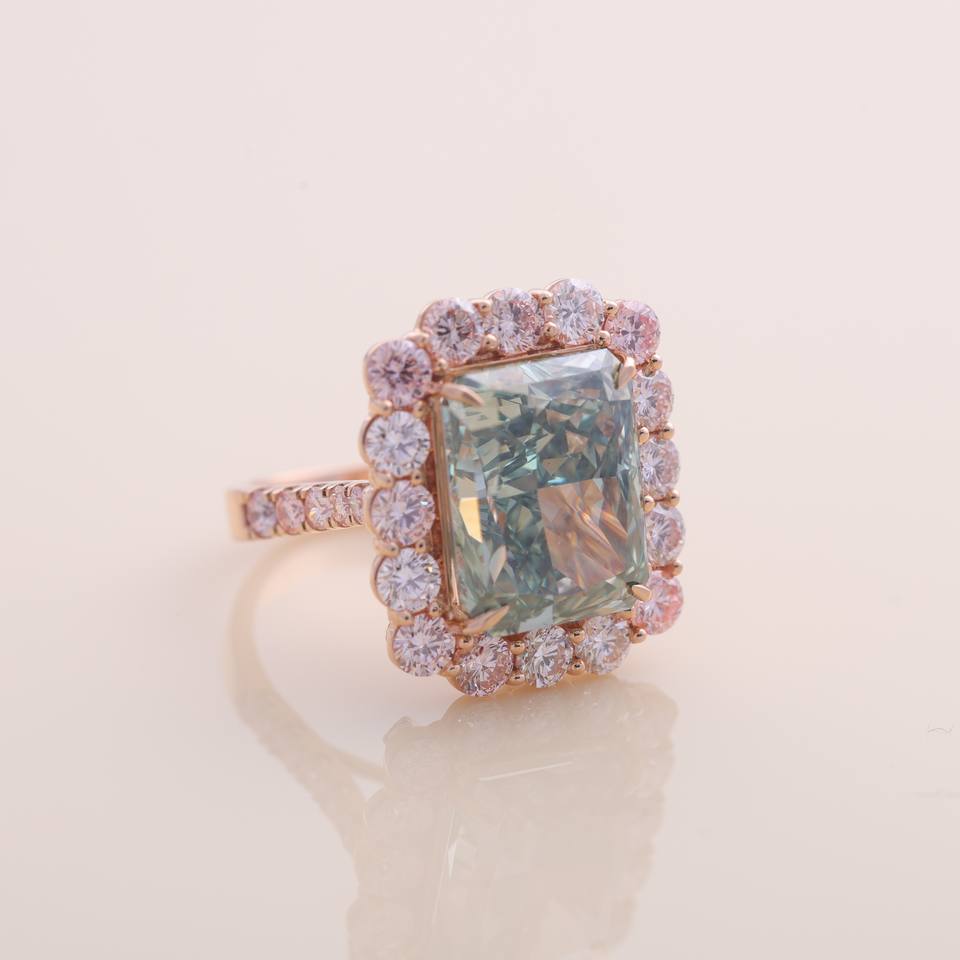 แหวนเพชรเม็ดเดี่ยวสีเขียวสดใส 18KT โรสโกลด์/เยลโลว์โกลด์/ไวท์โกลด์ ประดับด้วยเพชรเม็ดเล็กสีชมพู ได้รับการรับรองจาก IGI ชุบโรเดียม เครื่องประดับหรูหรา