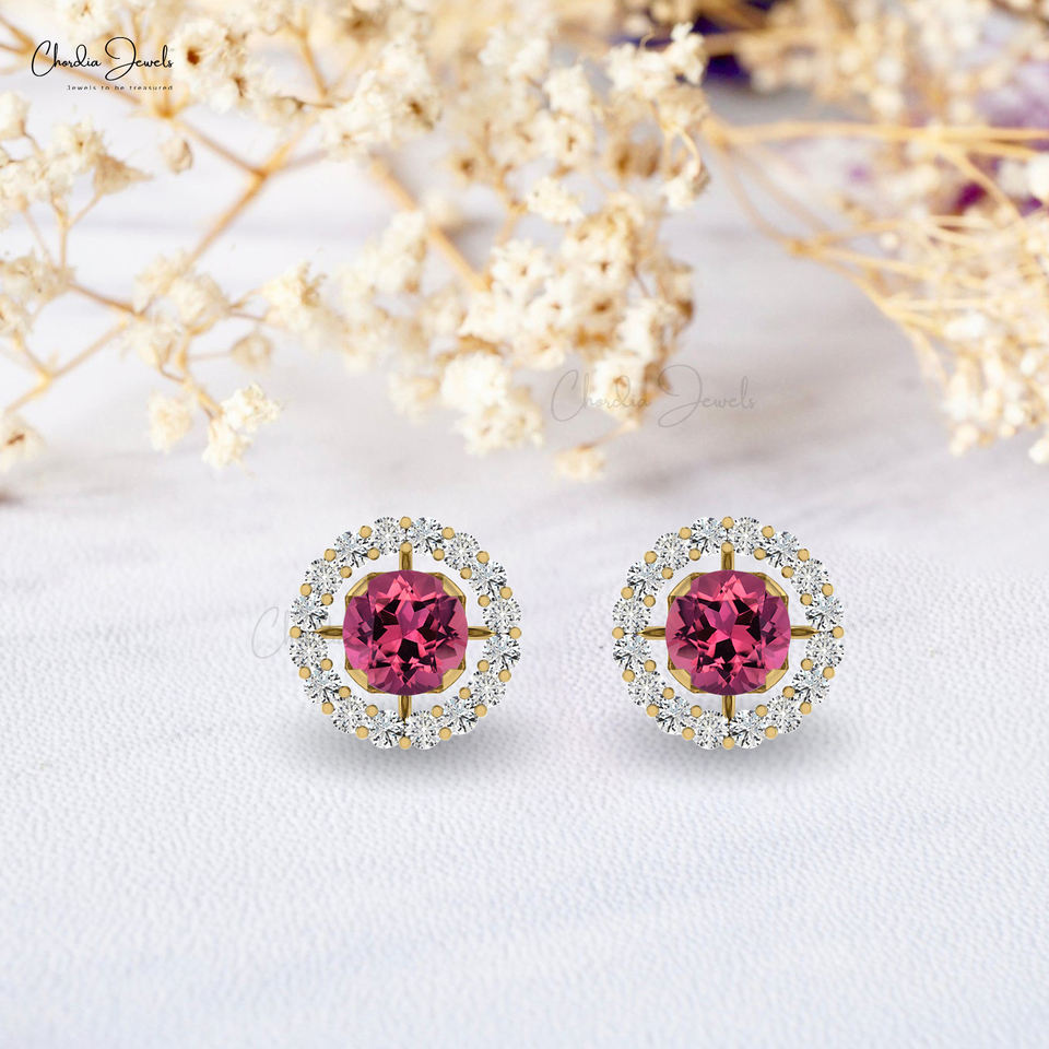 ต่างหูทองคำแท้14K ที่ทันสมัยสำหรับผู้หญิงประดับทัวร์มาลีนและเพชรแบบ0.5TCW สีชมพูแท้
