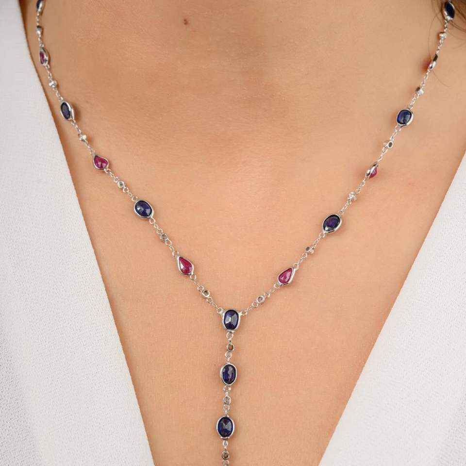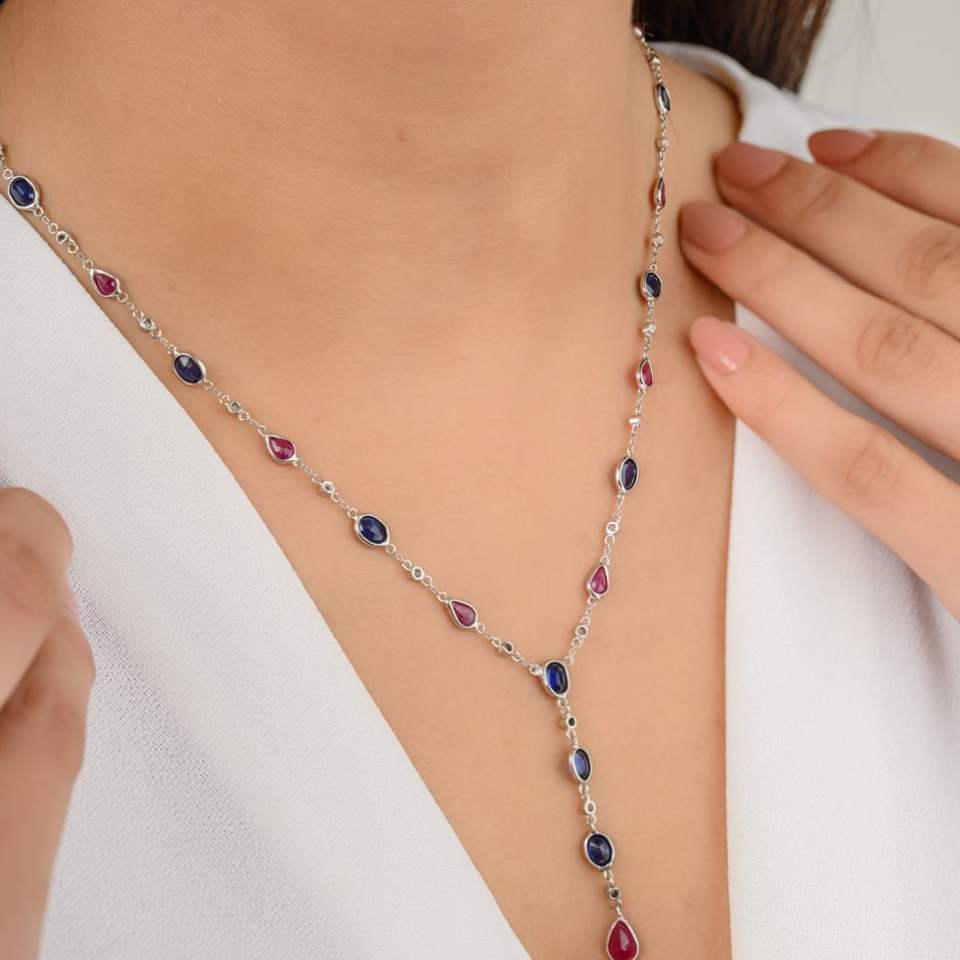 สร้อยคอสีขาวทอง18K ทันสมัยทำมือ100% ใหม่ทำด้วยมือไพลินทับทิมและเพชรเครื่องประดับแฮนด์เมด
