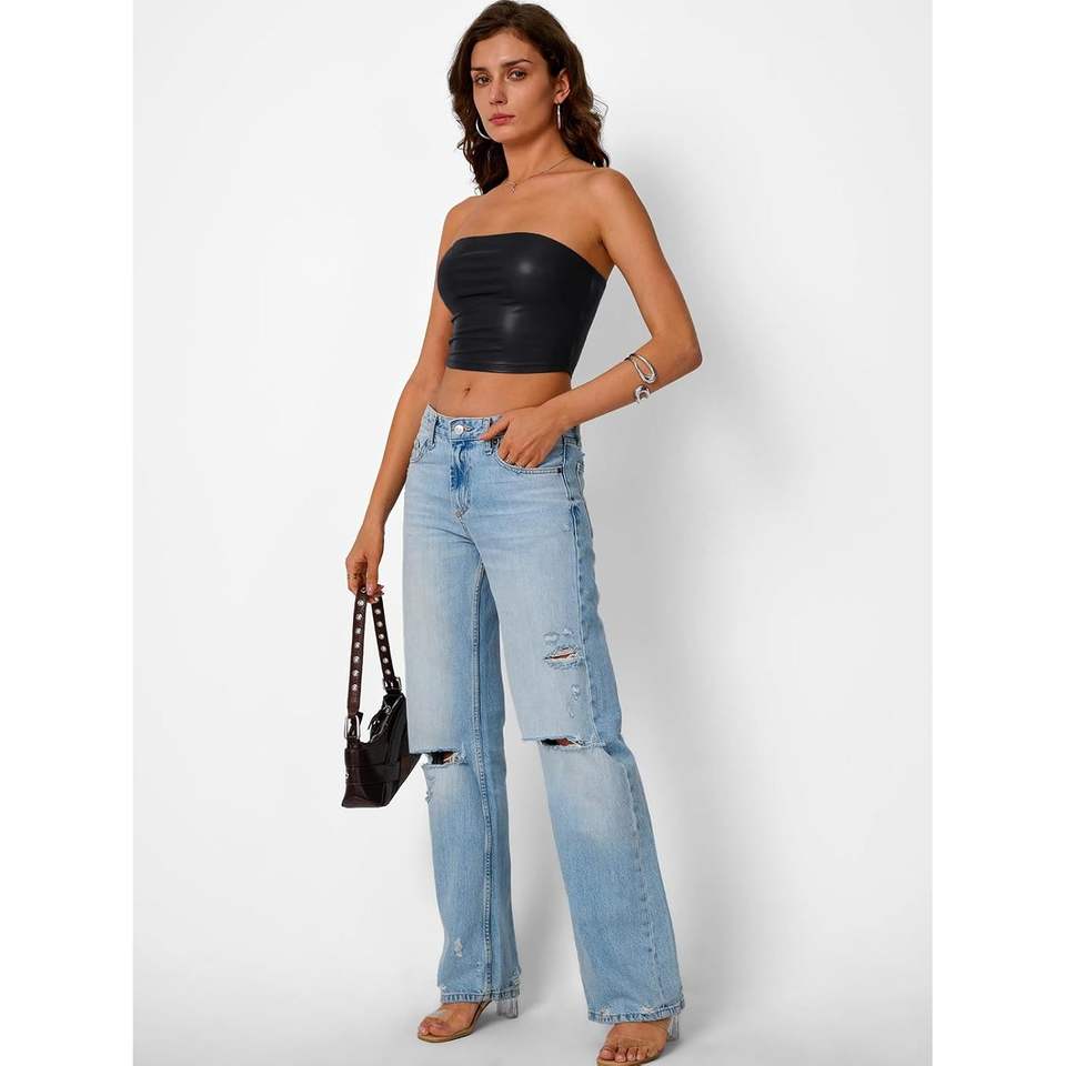 เสื้อครอปเกาะอกไร้สายแขนกุด2025ทันสมัยสำหรับผู้หญิงชุดฤดูร้อนน่ารักชุดหนังสำหรับออกไปคลับ