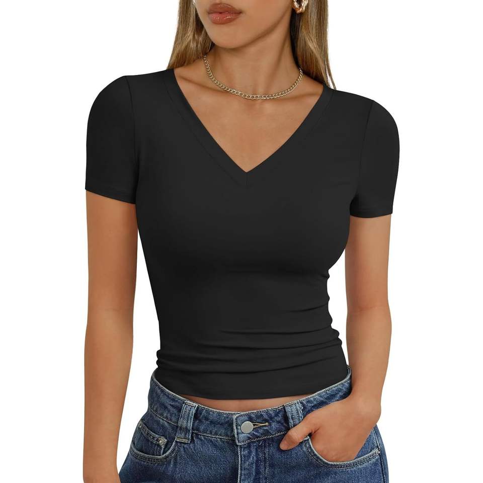 เสื้อยืดเอวลอยคอวีแบบเรียบง่ายสำหรับผู้หญิงอินเทรนด์2025ฤดูร้อนเสื้อยืดแฟชั่นยิมน่ารักสไตล์ Y2K สำหรับเสื้อเล่นโยคะ