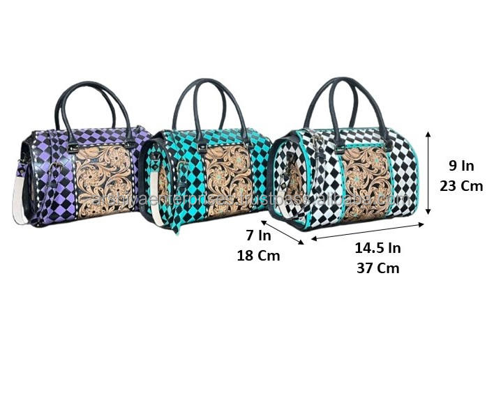Product name:Tooled Hair-On Cowhide Checkered Pattern Duffel Bag