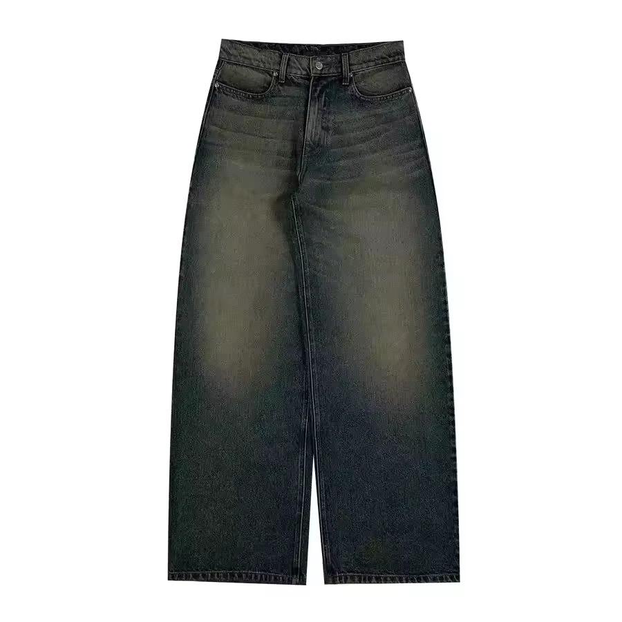 กางเกงยีนส์ทรงตรงขาบานสไตล์วินเทจฟอกสีซีดแบบดิสเทรสสำหรับผู้ชาย กางเกงยีนส์เอวสองชั้นคุณภาพสูงสั่งทำพิเศษสำหรับผู้ชาย