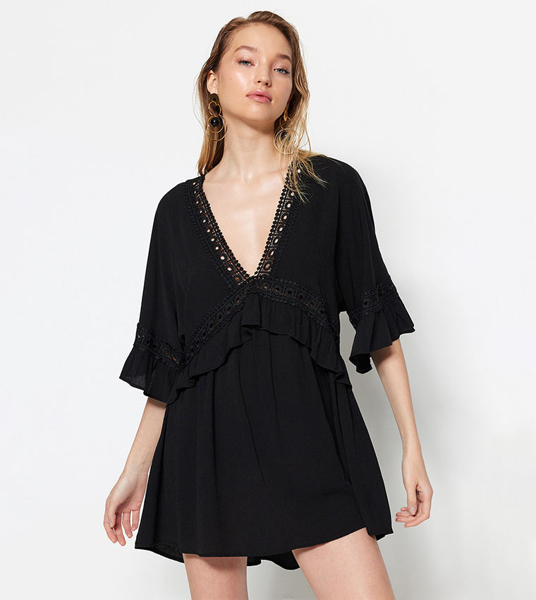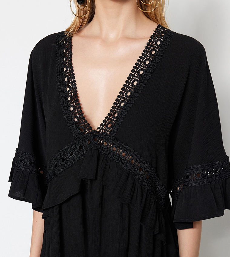 เดรสสั้นผ้าเรยอนสีดำสุดอินเทรนด์สำหรับผู้หญิงเดรสแขนสั้นลูกไม้ดีไซน์เนอร์เหมาะสำหรับชายหาดฤดูร้อนรีสอร์ทและชุดลำลอง