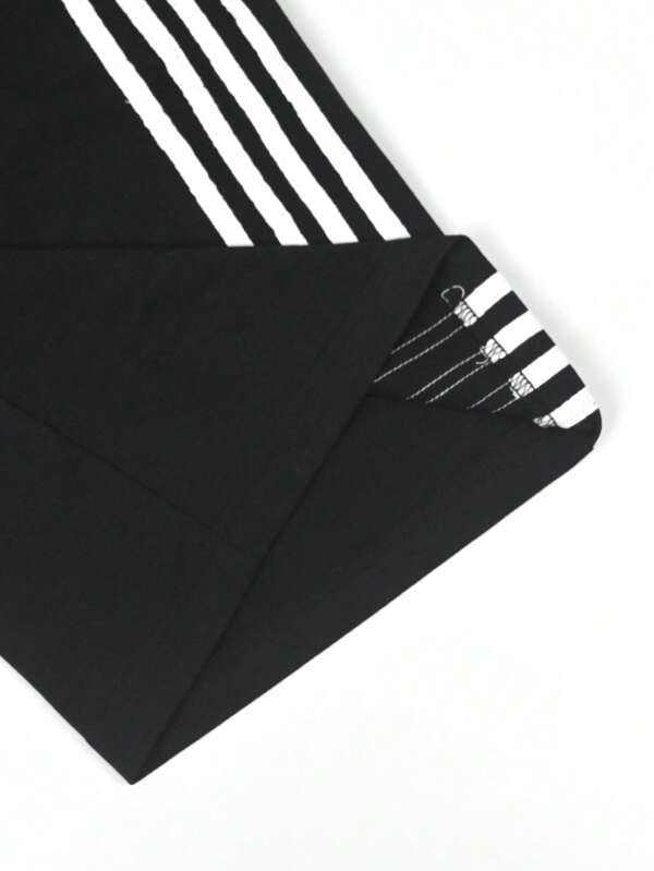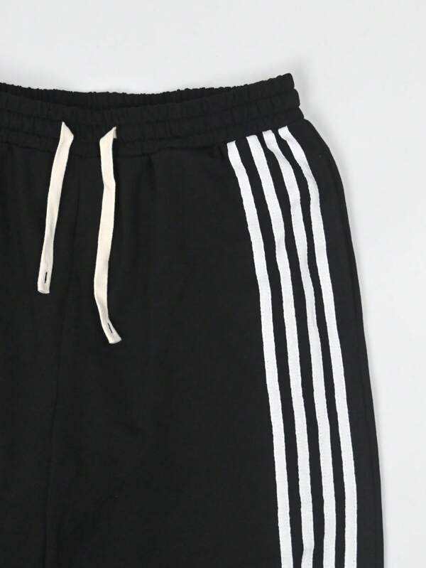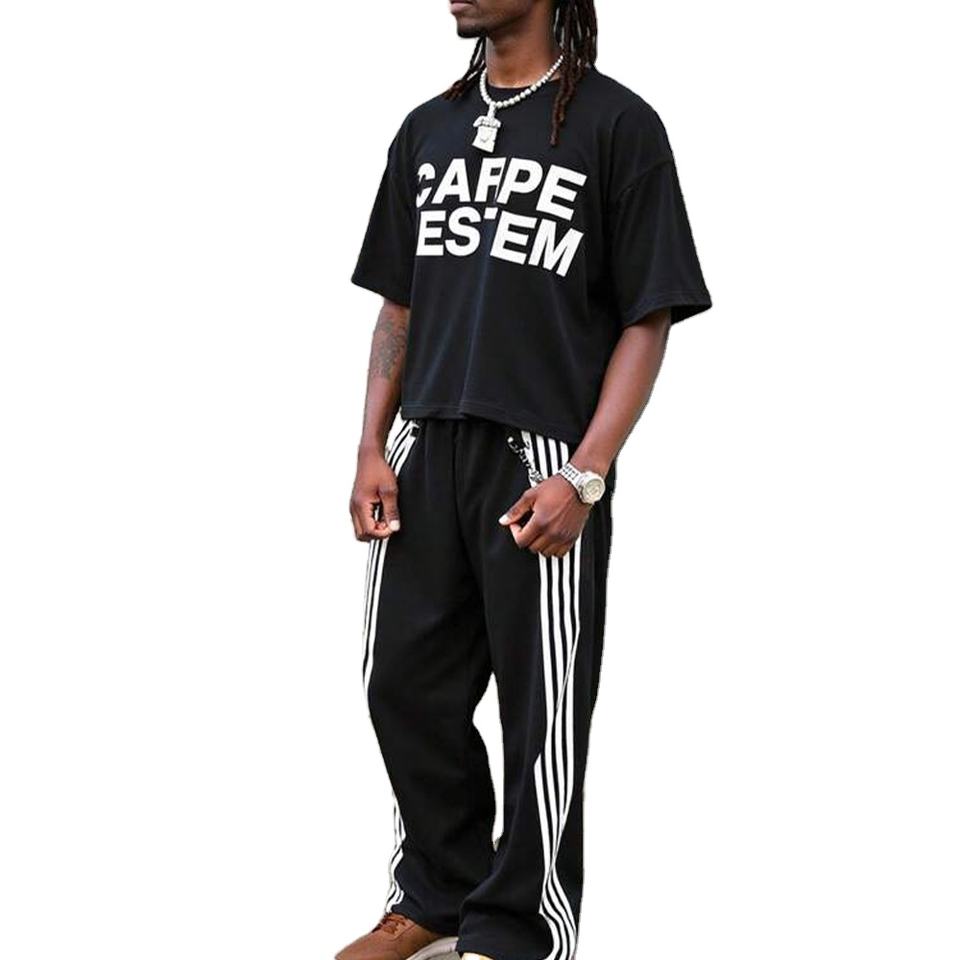 Trendy Black Cotton Streetwear Set for Men with Side Stripe Joggers & Drop Shoulder T-Shirt Custom Logo Two Piece Casual Outfit