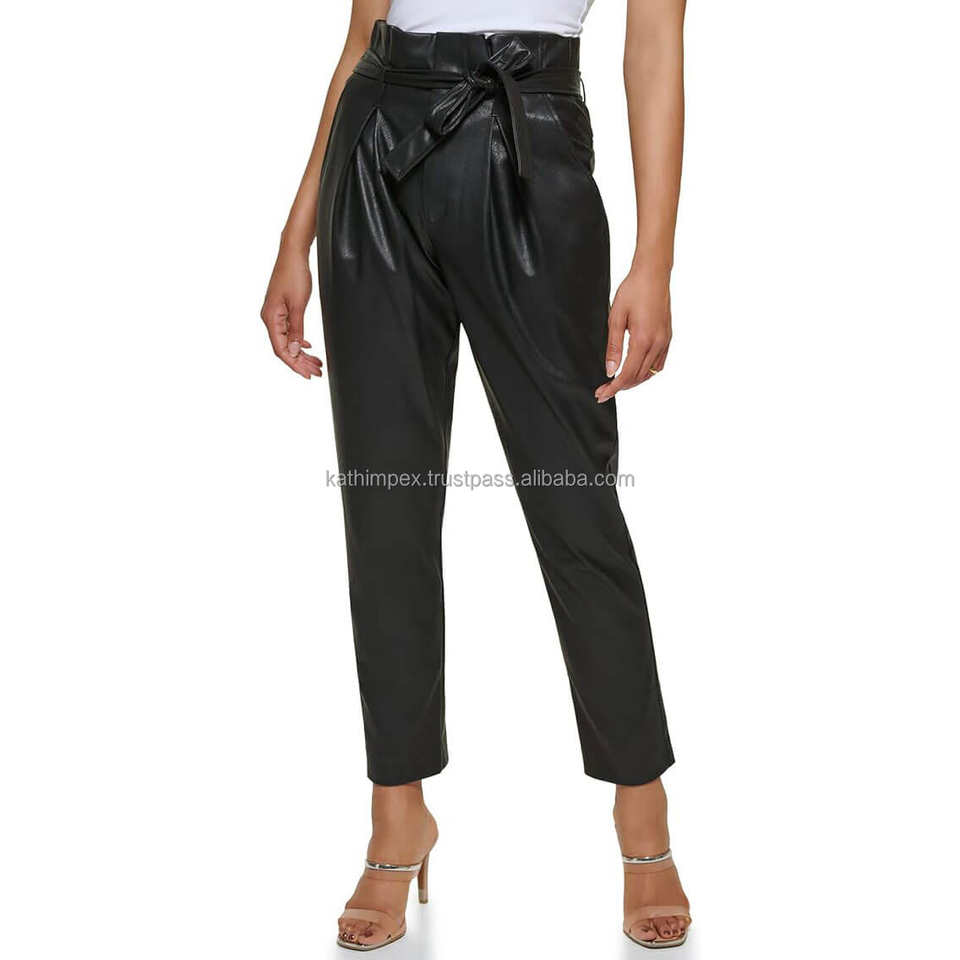 กางเกงเอวสูงทรงปกติสำหรับผู้หญิง ทำจากหนังเทียมสีดำทันสมัย ระบายอากาศได้ดี ผลิตด้วยมือ พร้อมจีบเอวและเข็มขัดผูก