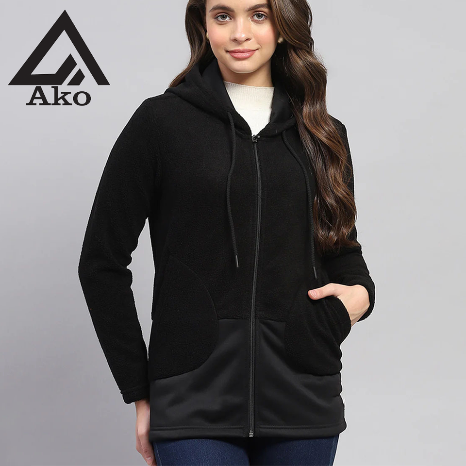 เสื้อฮู้ดซิปสีดำสุดเทรนดี้ พร้อมรายละเอียดผ้าที่โดดเด่น ความสบายที่เหนือระดับ เหมาะสำหรับลุคสบายๆ แต่ดูหรูหรา โดย Ako
