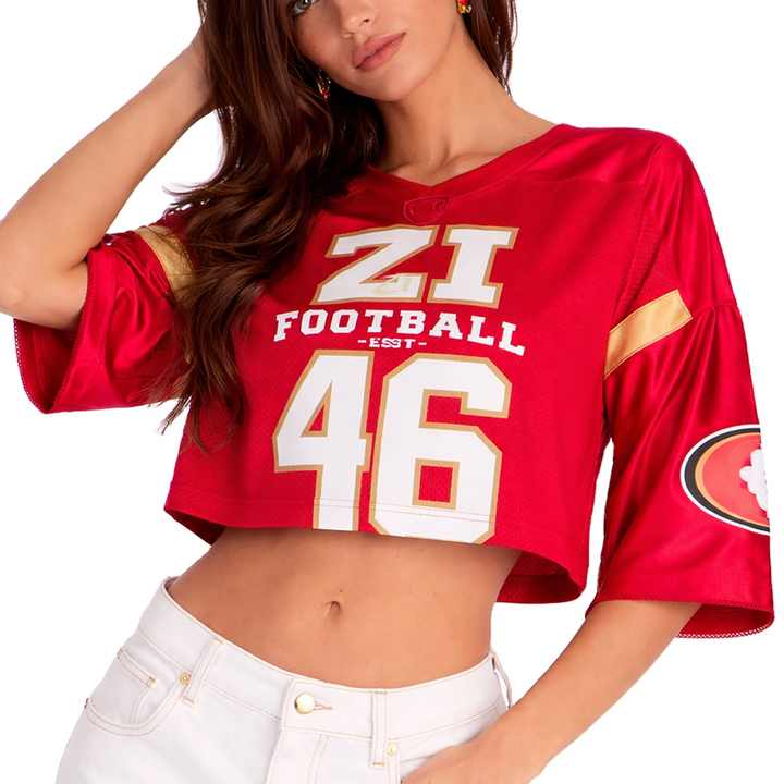 เสื้อเจอร์ซีย์อเมริกันฟุตบอลสีแดงทรงบ็อกซี่สุดเทรนดี้ ผ้าตาข่ายโพลีเอสเตอร์ แขนสั้น สปอร์ตแวร์ สไตล์ฮิปฮอป เสื้อครอปท็อปสำหรับผู้หญิง