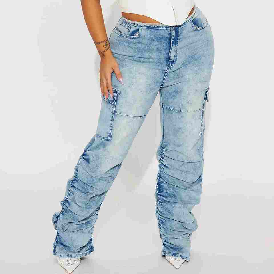 กางเกงยีนส์ทรงคาร์โก้ผู้หญิง แฟชั่นทันสมัย ระบายอากาศได้ดี เอวสูง 6 กระเป๋า ทรงหลวม ไซส์ใหญ่