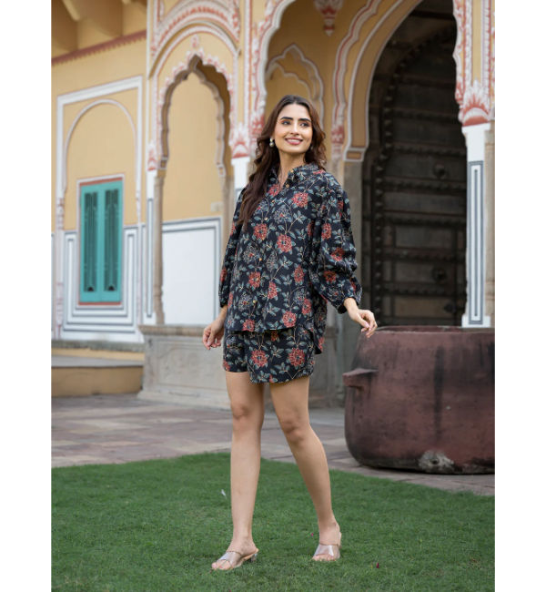ชุดลำลองสามชิ้น เสื้อเชิ้ตผ้าเรยอนพิมพ์ลายดอกไม้สีน้ำเงินเข้ม แขนจั๊มพ์ กางเกงขาสั้น พร้อมเสื้อครอปท็อป สไตล์ทันสมัย