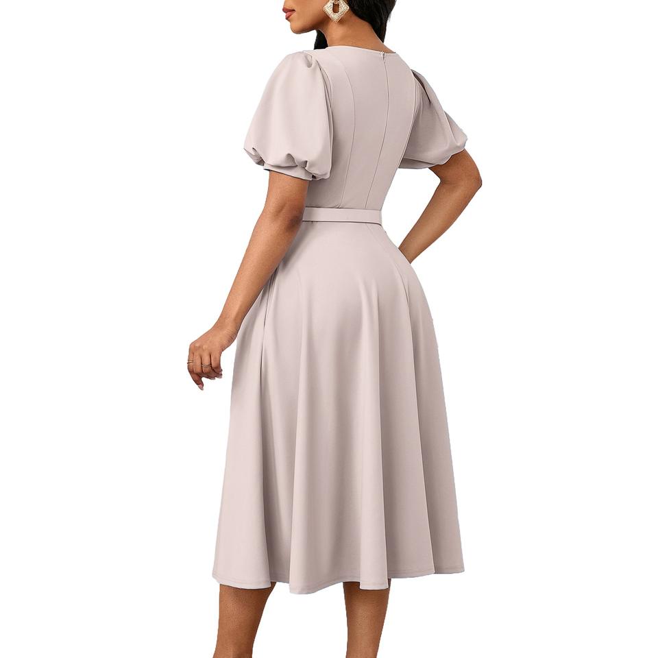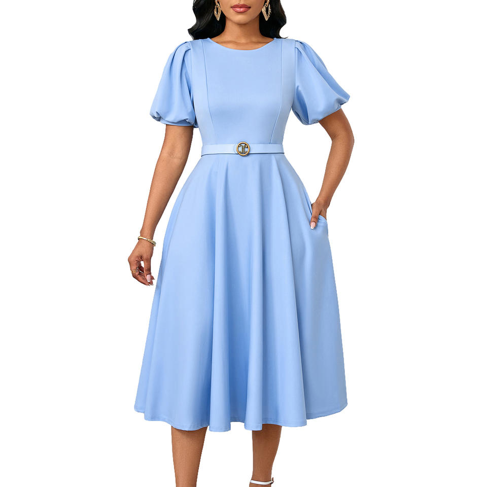 ชุดเดรสลำลองทันสมัยสำหรับผู้หญิง สไตล์เรียบหรู สีพื้น แขนสั้น จับจีบ พร้อมเข็มขัด เหมาะสำหรับใส่ทำงาน