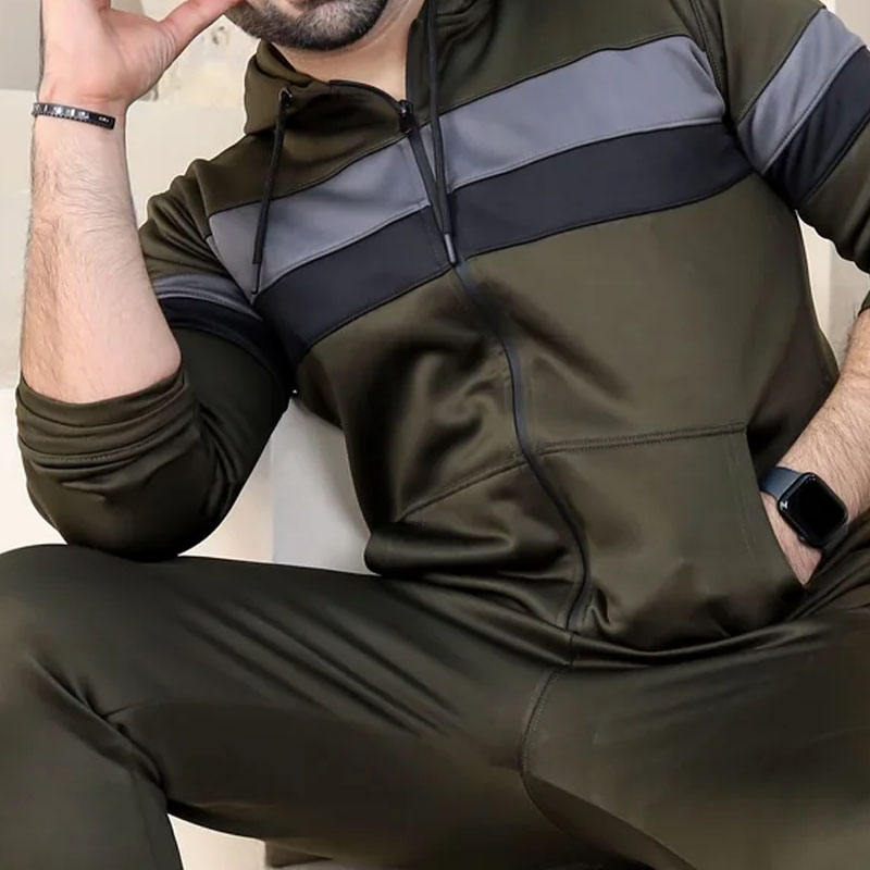ชุดวอร์มสำหรับผู้ชายสีและการออกแบบที่ทันสมัยสีเขียวมะกอกมีสีเทาและสีดำลายบล็อกลายทางขนาดพอดีตัวปกติ
