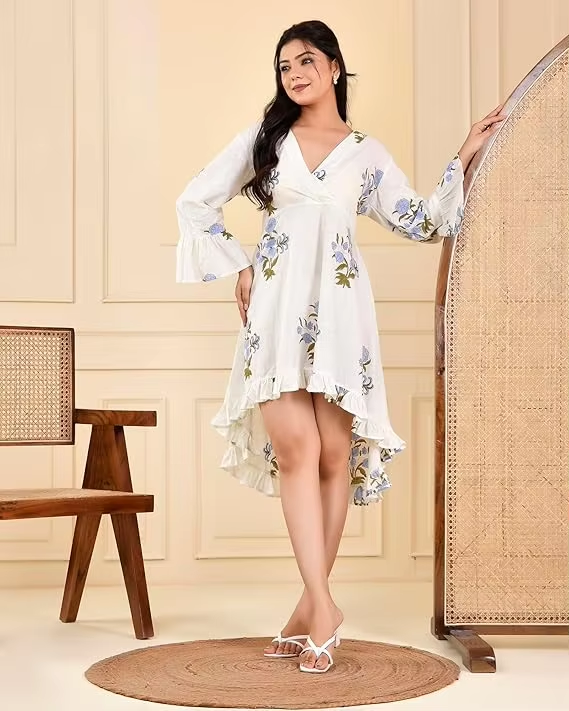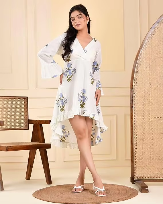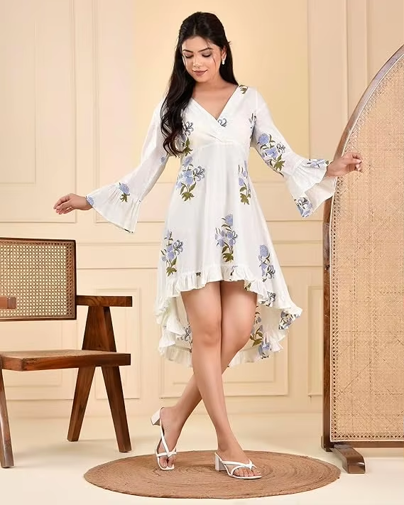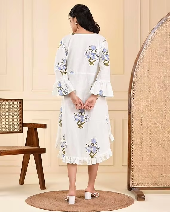 ชุดเดรสผ้าไหมเครปทันสมัยสีขาวมีแขนกระดิ่งพิมพ์ลายดอกไม้และผ้าพริ้วไหวในช่วงฤดูร้อน