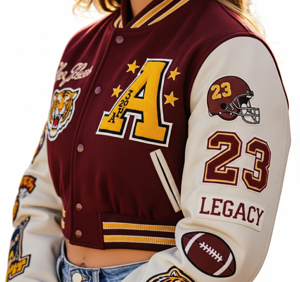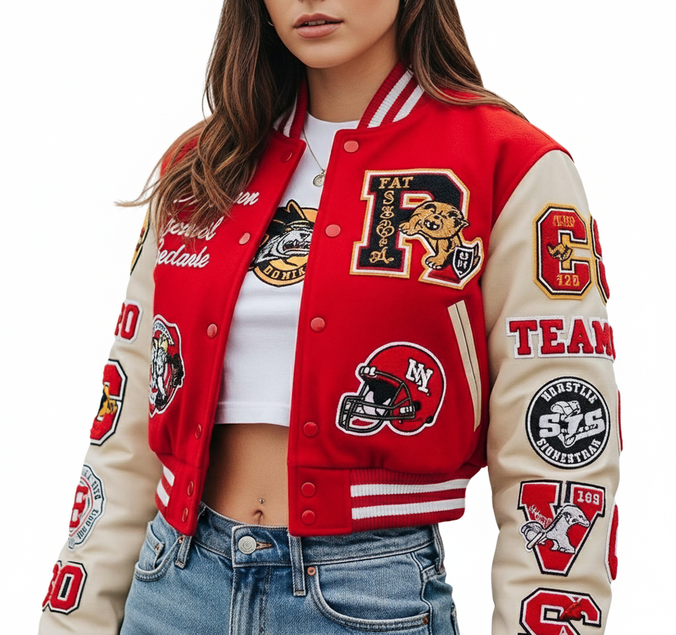 แจ็คเก็ตวาร์ซิตี้ทรงครอปสุดฮิต สไตล์ Y2K แจ็คเก็ตเลตเตอร์แมนสำหรับผู้หญิง รับทำโลโก้ตามสั่ง