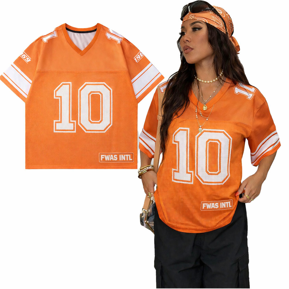 เสื้อบาสเก็ตบอลสีส้มขาวแบบกำหนดเองสุดเทรนดี้ เสื้อยืดซับลิเมชั่นผ้าตาข่ายแห้งเร็วสำหรับผู้ชาย แฟชั่น Y2K เสื้อยืดอเมริกันฟุตบอล