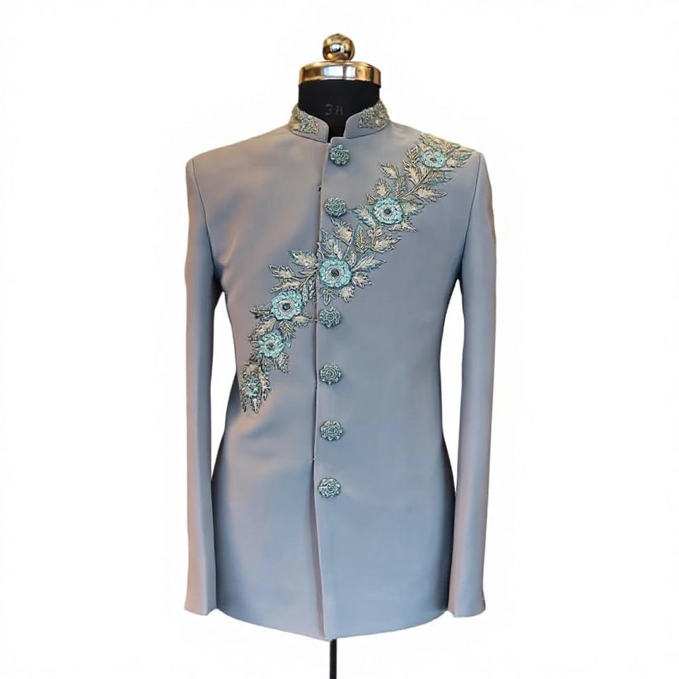 ชุดเชอร์วานีและกางเกงเจ้าบ่าวสุดหรูทันสมัย พร้อมงานปักสีสันสดใส ประดับด้วยคริสตัลแก้วและงานปักดิ้นดั๊บก้า สำหรับงานแต่งงาน