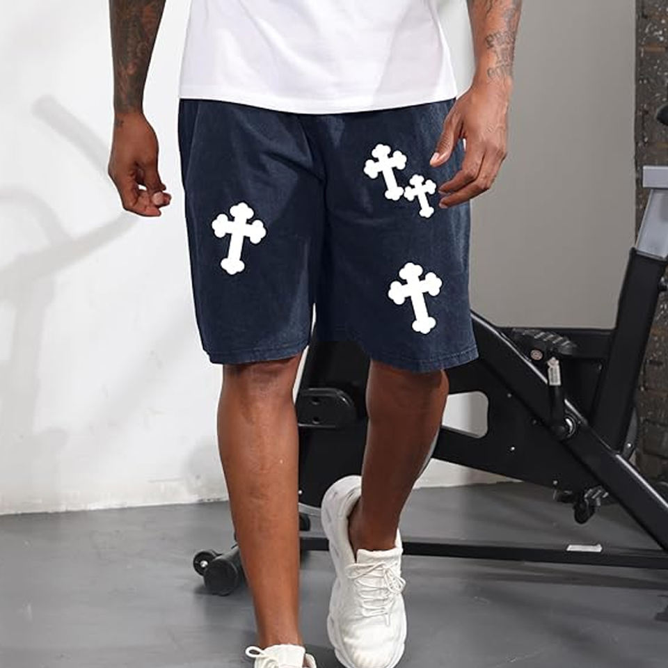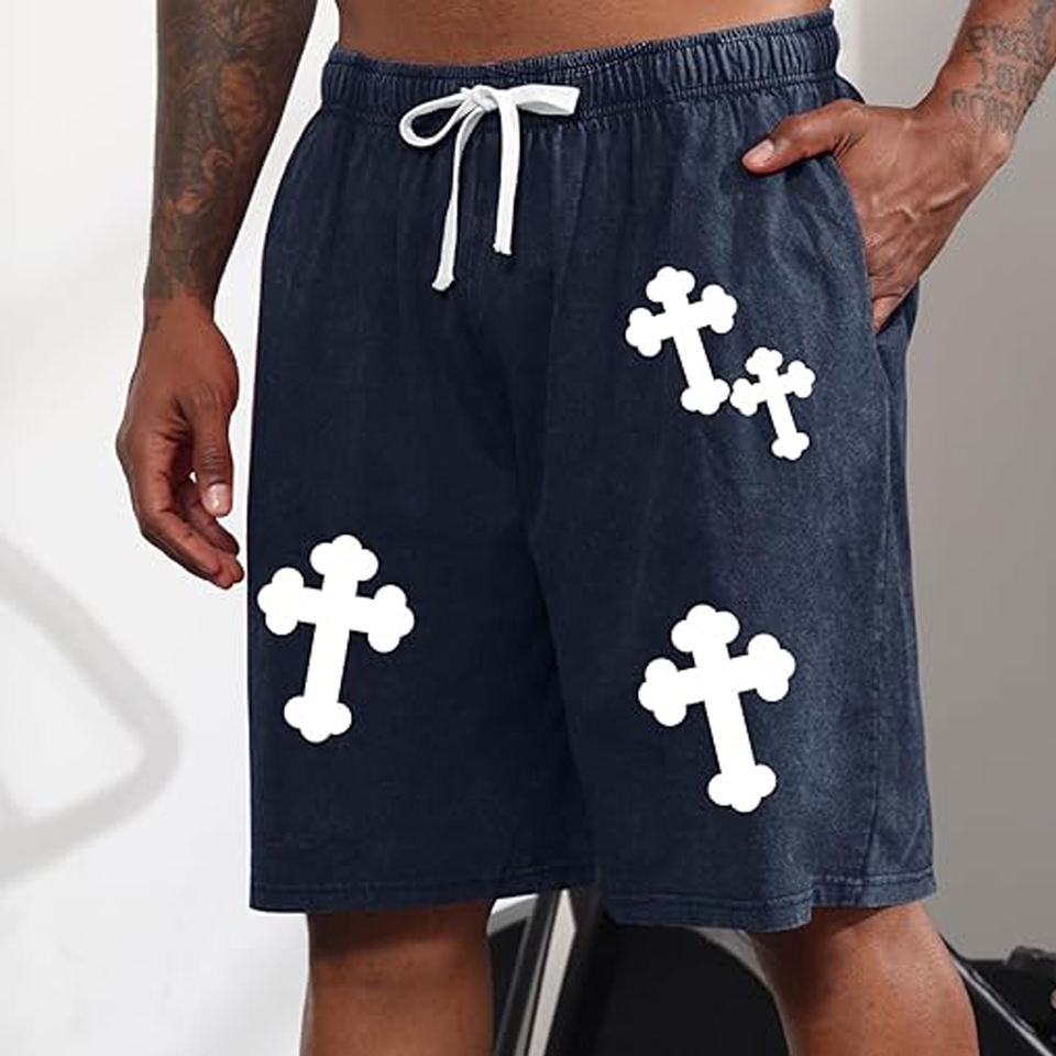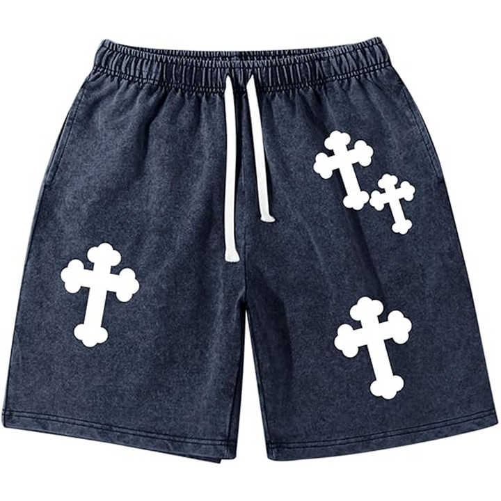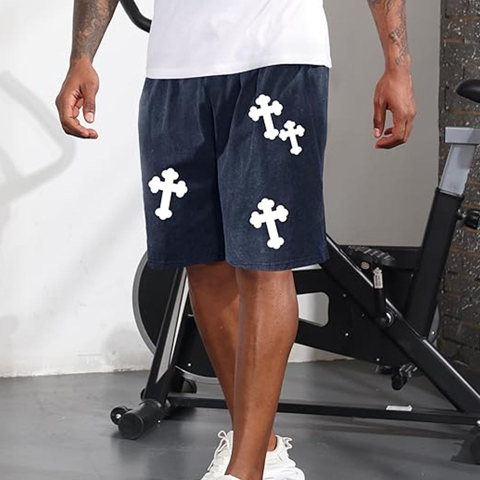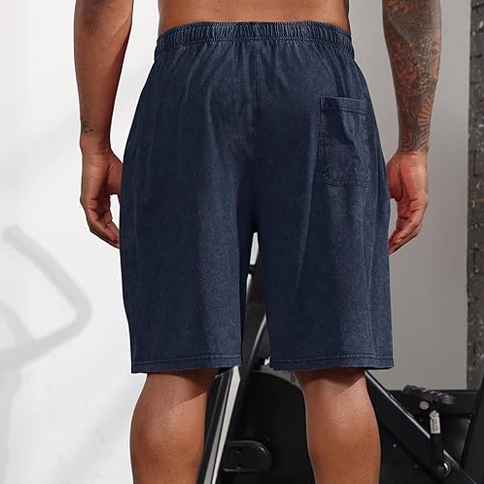 กางเกงขาสั้นเทรนดี้ดีไซน์ยีนส์ฟอกสี ผ้าฝ้ายเฟรนช์เทอร์รี่ พิมพ์ลายขอบเอว กางเกงจ็อกเกอร์ผู้ชายฟอกสีซันเฟด