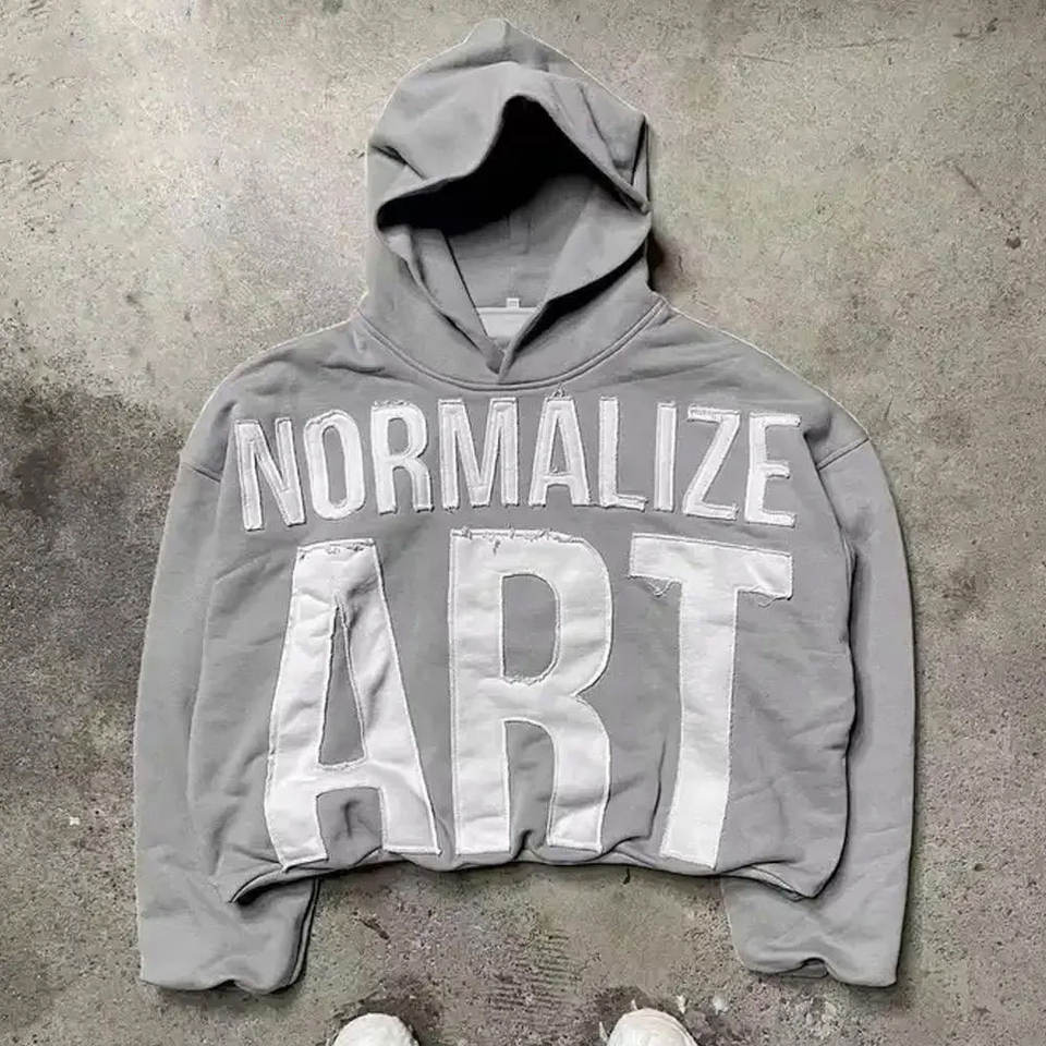 Trendy Distressed Embroidery Winter Hoodie 100% Cotton Eco-Friendly Soft Fleece Warm Oversized Pocket Design Urban Streetwear
