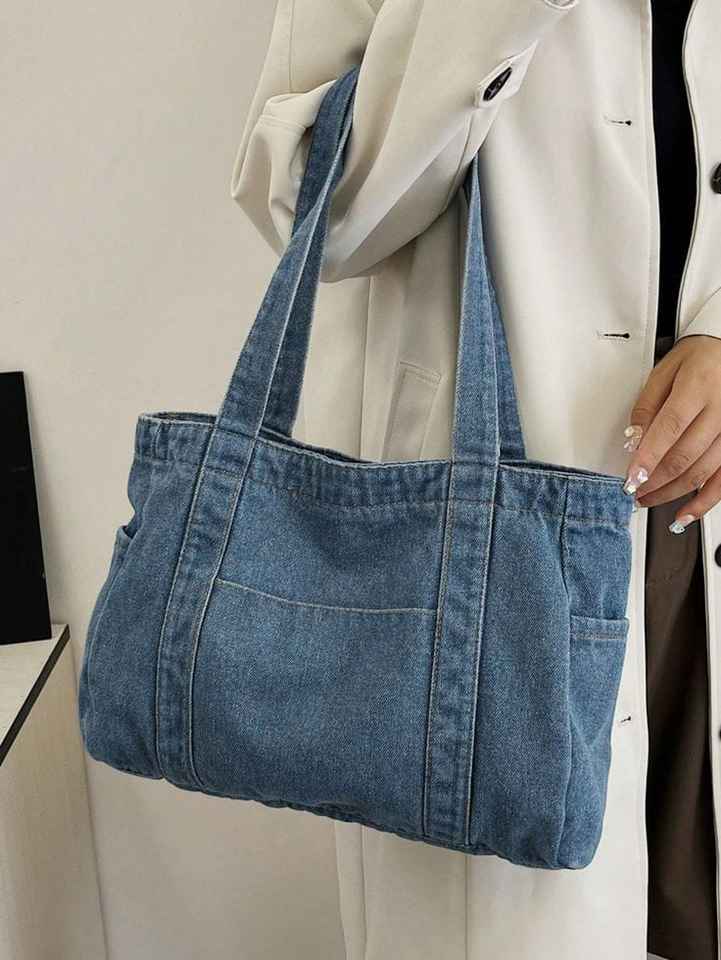 กระเป๋าโท้ทผ้าเดนิมแฟชั่นทันสมัยพร้อมช่องด้านหน้า กระเป๋าโท้ทสะพายไหล่ผ้าแคนวาสสีน้ำเงินสำหรับใช้ช้อปปิ้งประจำวัน ไปเที่ยวชายหาด
