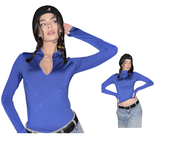 เสื้อแขนยาวทันสมัยแขนเสื้อจักรยานพอดีตัวเสื้อมีซิปหน้ารูหัวแม่มือสีทึบเข้ารูปแบบลำลอง