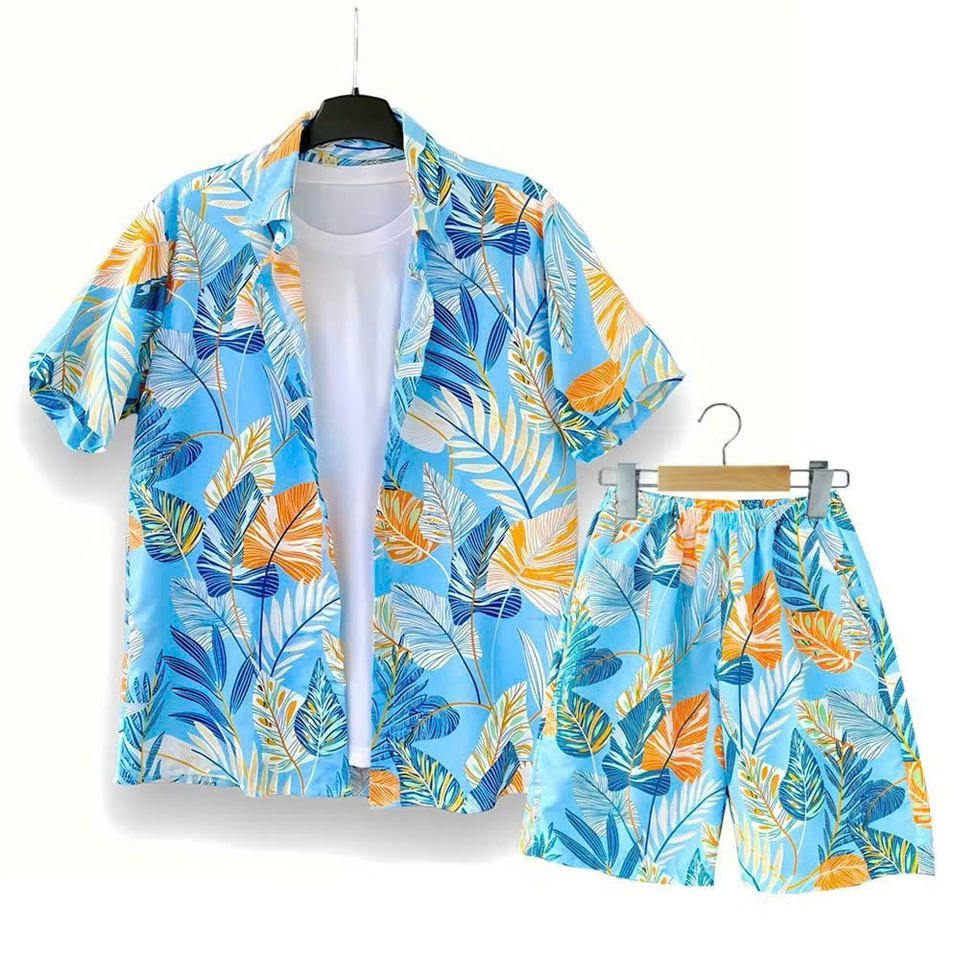 เสื้อยืดผู้ชายอินเทรนด์ฤดูร้อนฤดูร้อนสั้นสบายๆผ้าทอตัดสะดุดตาพิมพ์ลายใบไม้สีทึบสดใสแฟชั่นลำลอง