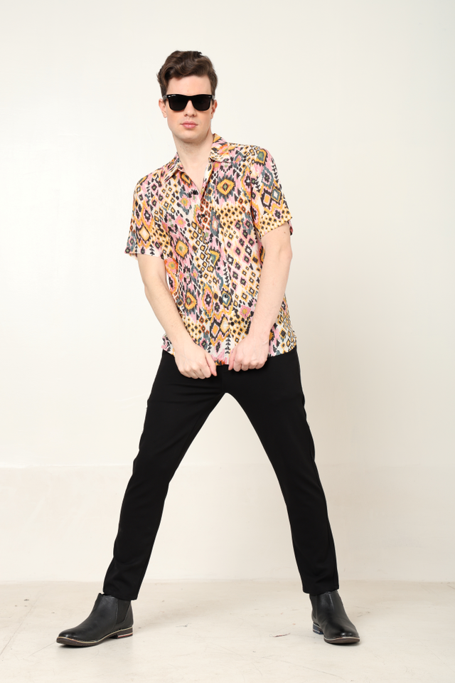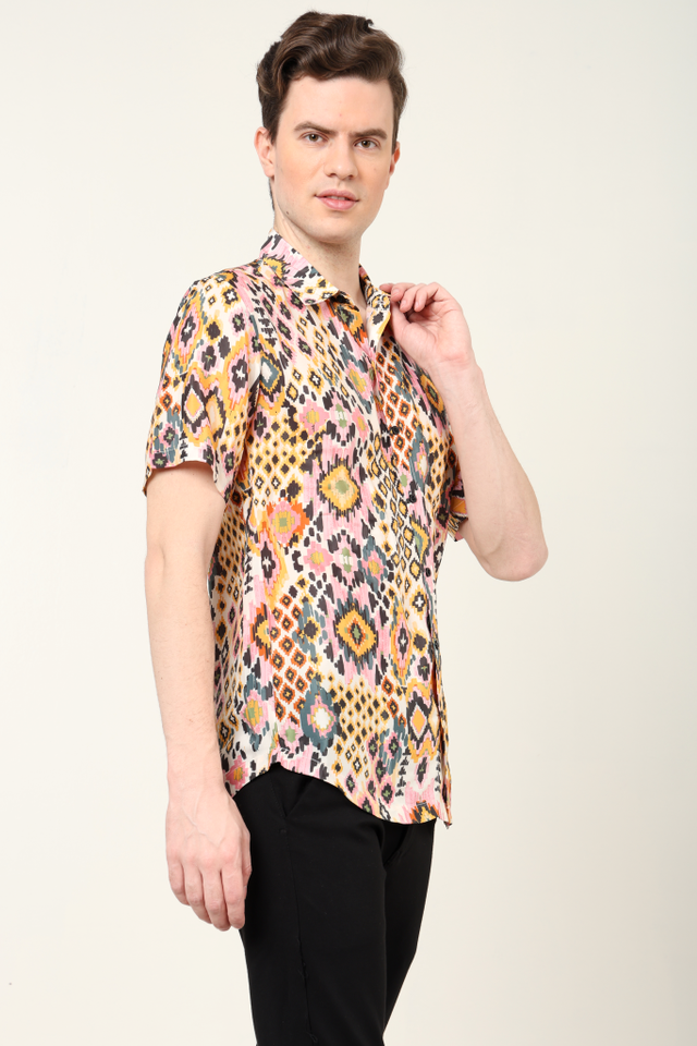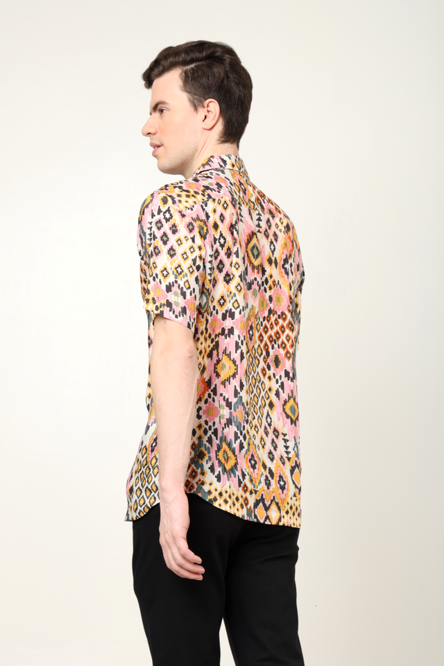 เสื้อเชิ้ตผู้ชายแฟชั่น พิมพ์ลายอิคัทหลากสี ผลิตจากโพลีเอสเตอร์ ทรงปกติ คอปกเสื้อ แขนสั้น เหมาะสำหรับใส่ลำลอง