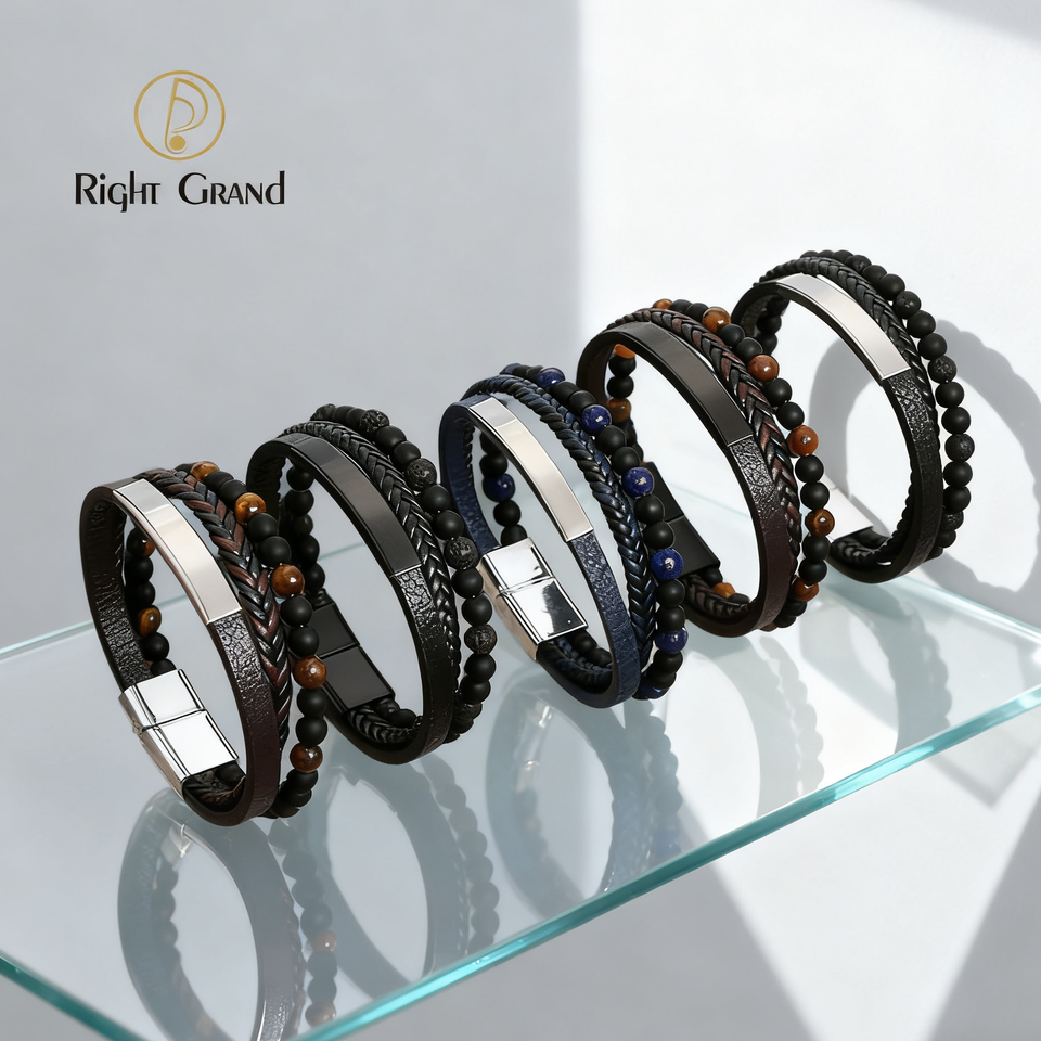 สร้อยข้อมือหนังหลายชั้นทันสมัยสำหรับผู้ชาย สไตล์คลาสสิก ทำด้วยมือ ประดับด้วยหินลาวา พร้อมตัวล็อคแม่เหล็ก ของขวัญเครื่องประดับ