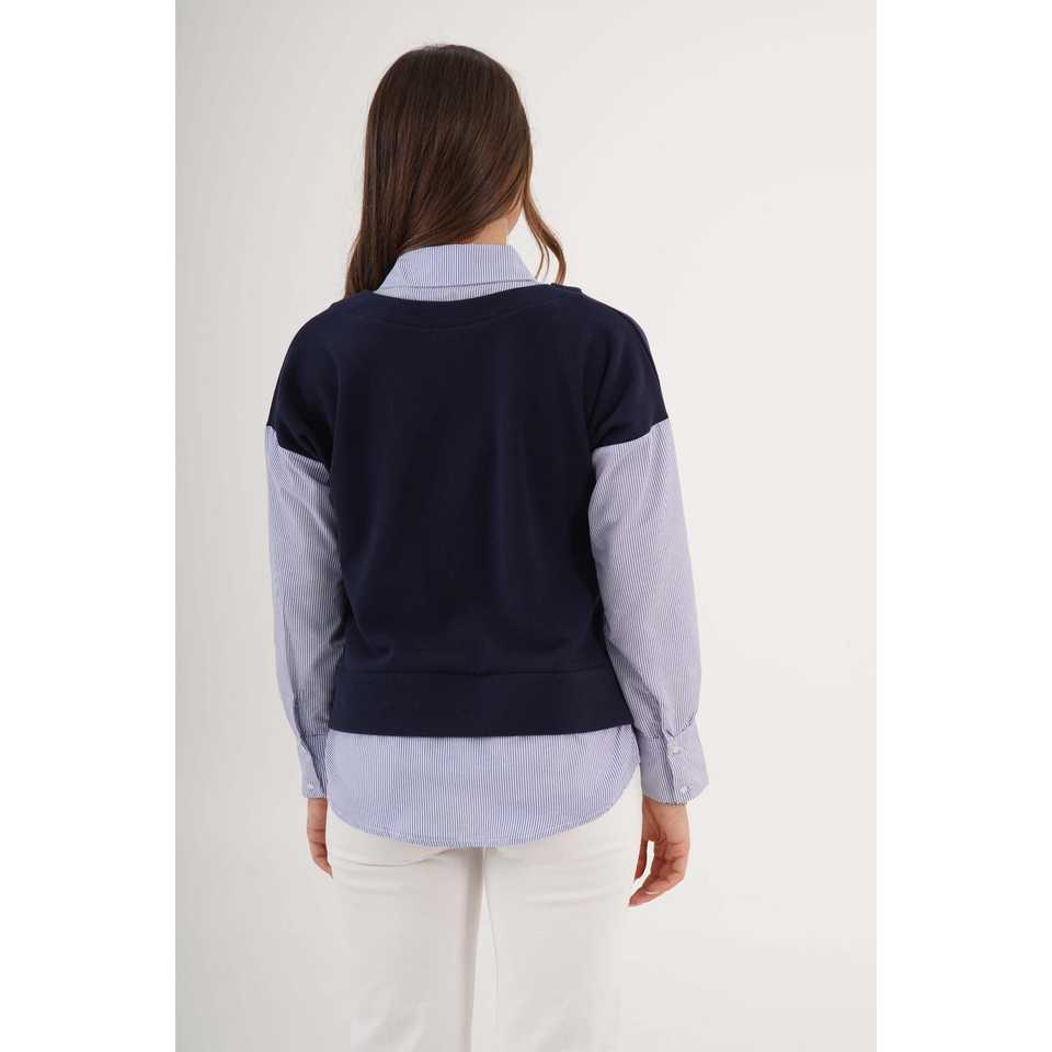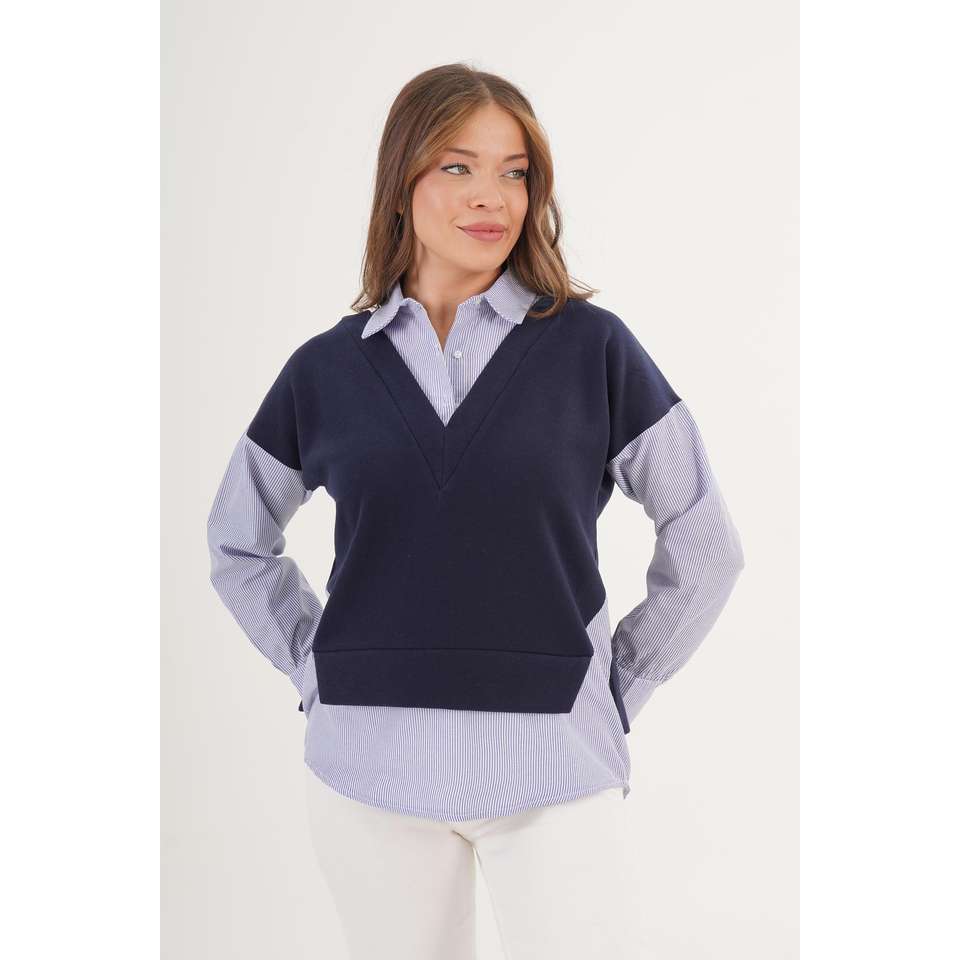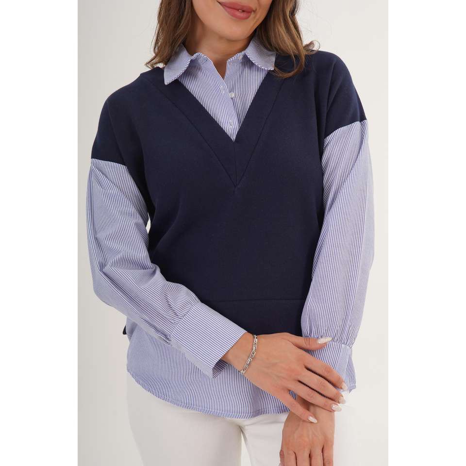 เสื้อเบลาส์ผู้หญิงสีน้ำเงินกรมท่าสุดฮิต พร้อมดีเทลเสื้อเชิ้ต ขายส่งเครื่องประดับแฟชั่น