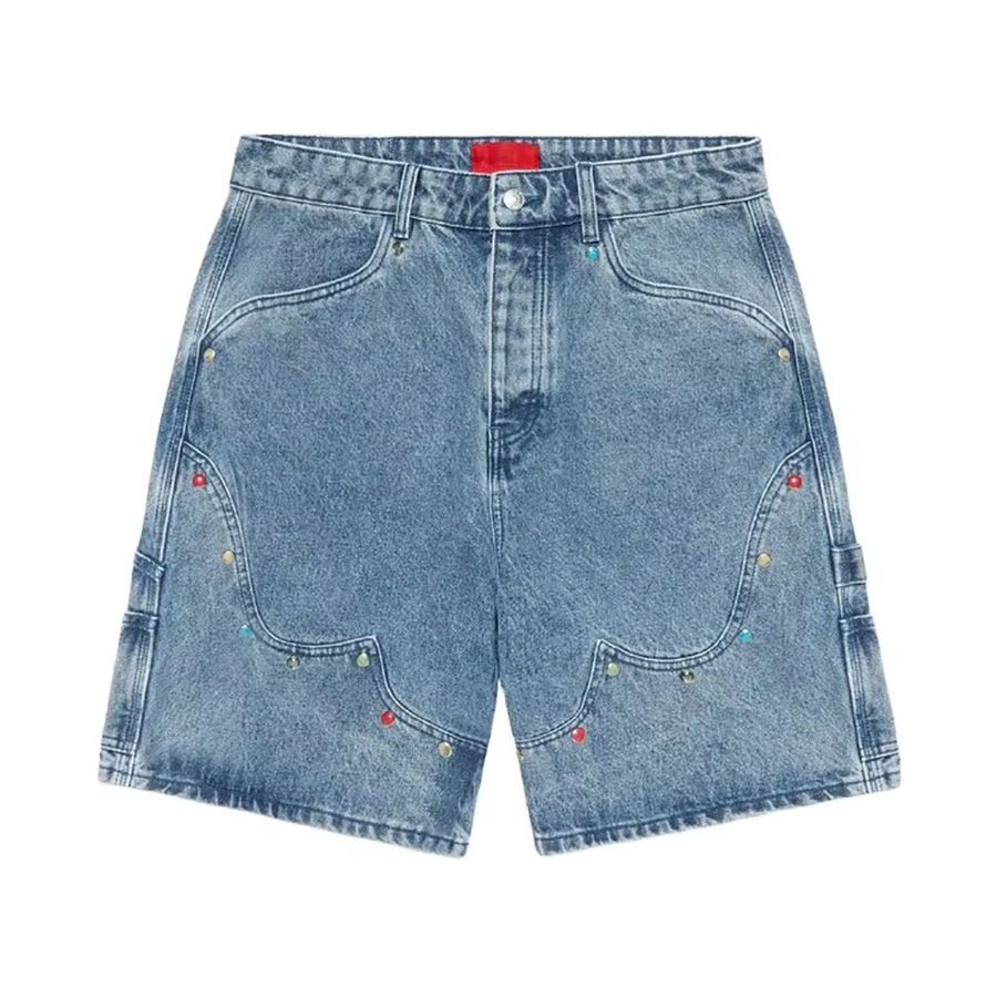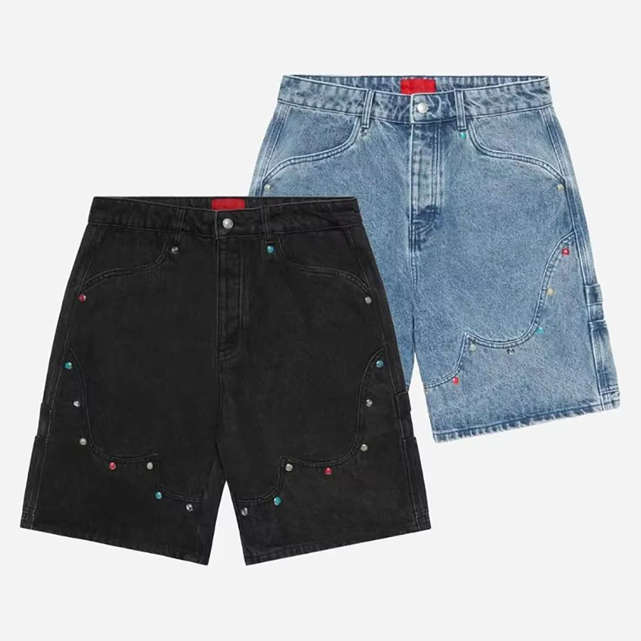 กางเกงยีนส์ขาสั้นผู้ชายดีไซน์เท่ห์ทันสมัยสำหรับฤดูร้อน สไตล์ไฮสตรีท คุณภาพสูง ประดับด้วยคริสตัล