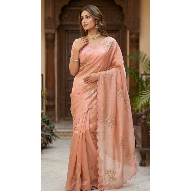 ชุดส่าหรีผ้าฝ้ายสีพีชทันสมัยสำหรับงานปาร์ตี้ผู้ใหญ่ พร้อมงานปักลายทองละเอียดอ่อน สไตล์โมเดิร์นผสมผสานความดั้งเดิม