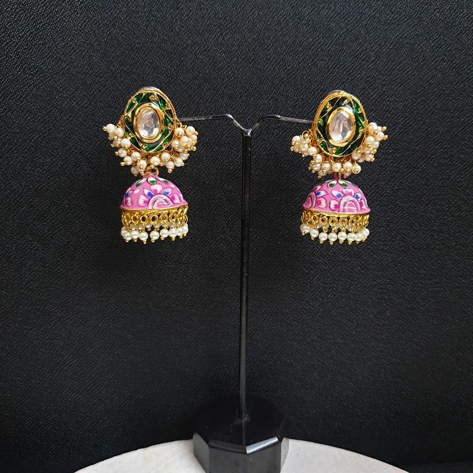 ต่างหู Jhumki Kundan ทาสีด้วยมือสีเขียวชมพูแบบทันสมัยห่วงน่ารักและแบบหมุดประดับพู่ทำจากทองเหลืองสแตนเลสสำหรับงานเลี้ยงชาติพันธุ์