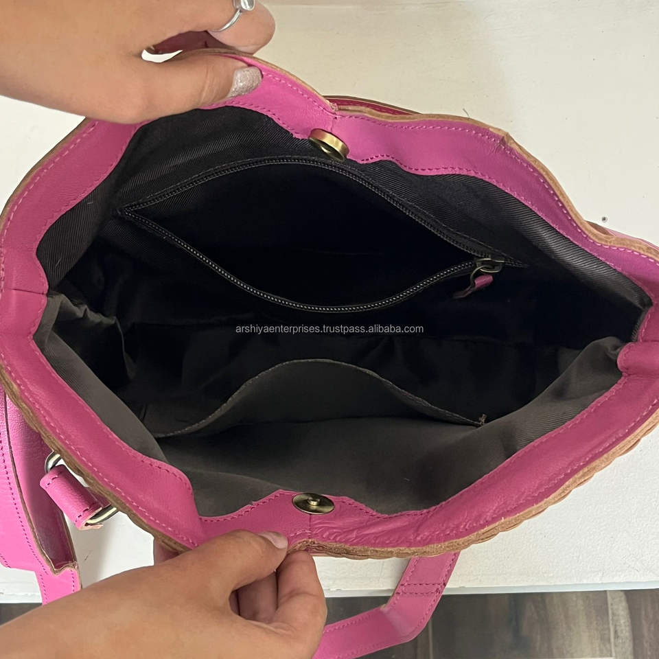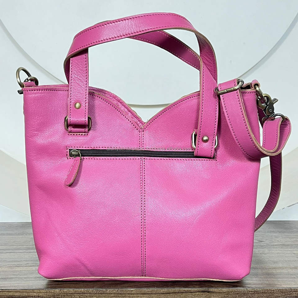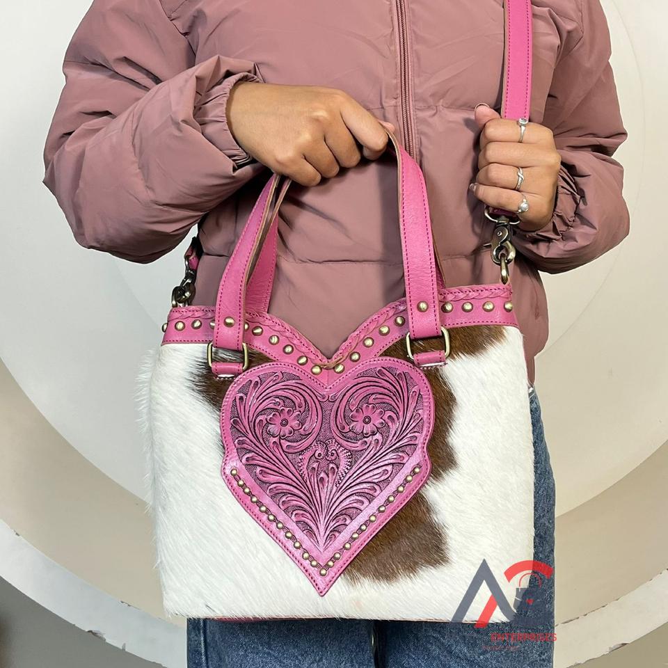 กระเป๋าถือผู้หญิงหนังวัวแท้ลายหัวใจสีชมพูสุดฮิต ดีไซน์เก๋ ทำมืออย่างหรูหรา พร้อมหูหิ้วและสายสะพายข้าง