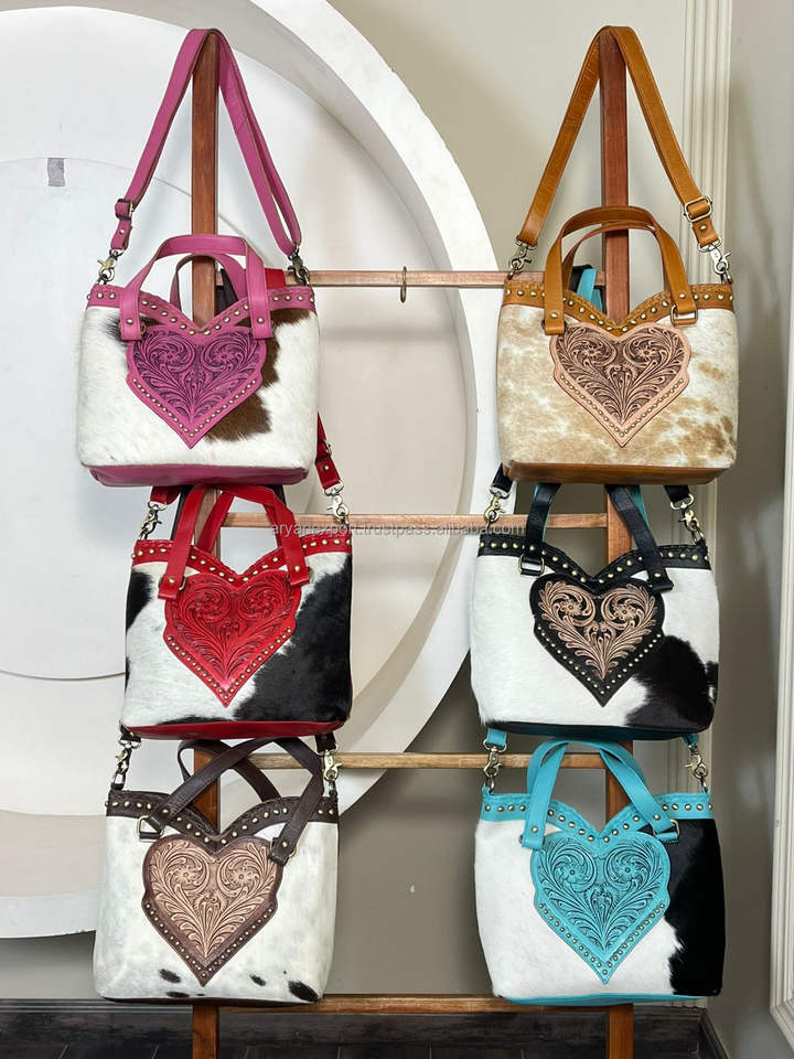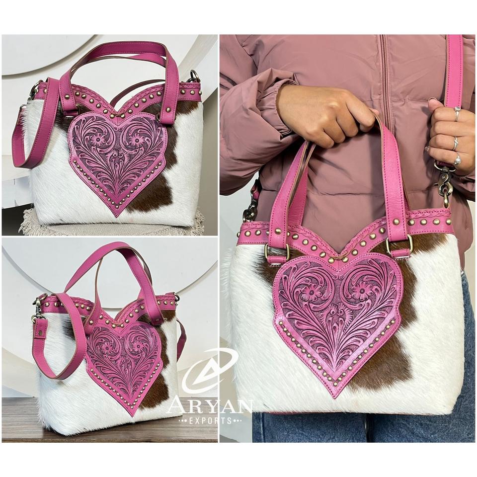 กระเป๋าถือผู้หญิงหนังวัวแท้ลายหัวใจสีชมพูสุดฮิต ดีไซน์เก๋ ทำมืออย่างหรูหรา พร้อมหูหิ้วและสายสะพายข้าง