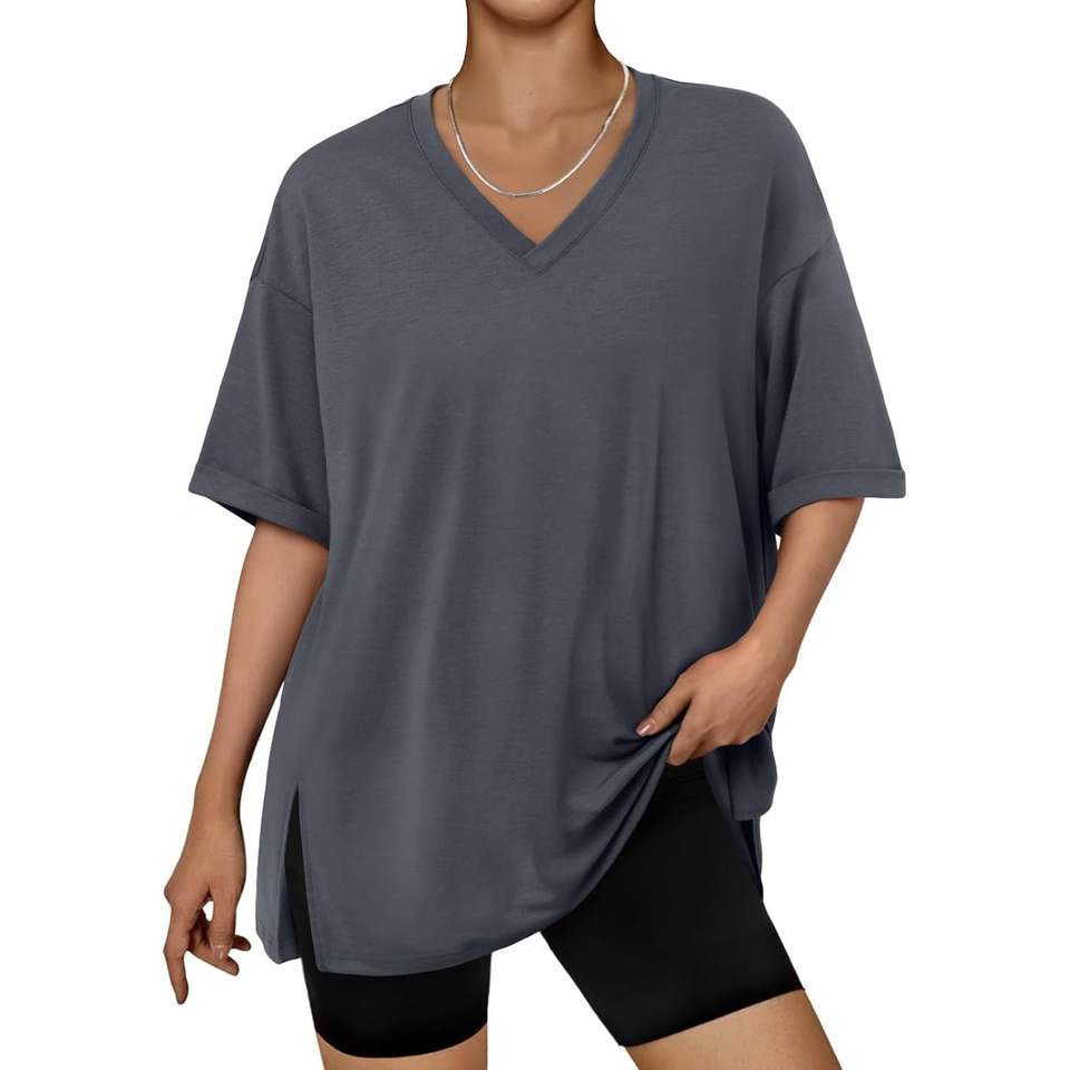 เสื้อออกกำลังกายคอวีขนาดใหญ่พิเศษสำหรับผู้หญิงเสื้อออกกำลังกายแขนสั้นลำลองทรงหลวมแบบเรียบง่ายสำหรับผู้หญิง