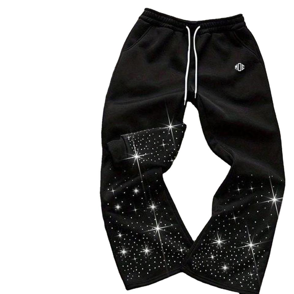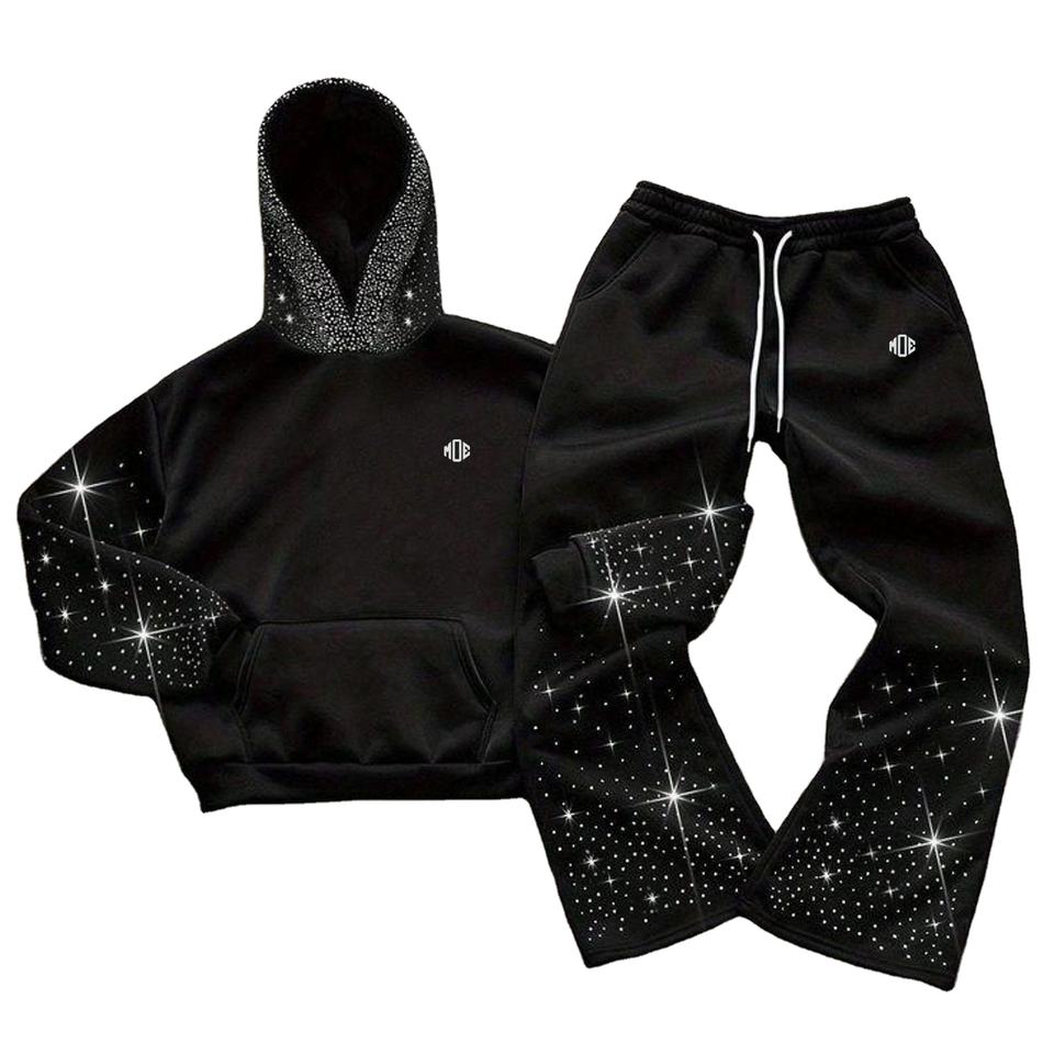 ชุดเซ็ตแทรคสูทประดับเพชรเทียมสุดเทรนดี้ เสื้อฮู้ดดี้และกางเกงจ็อกเกอร์สไตล์สตรีทแวร์สำหรับผู้ชาย ชุดสองชิ้นประดับเพชรเทียมแบบ OEM เสื้อผ้าขายส่งแบบ OEM