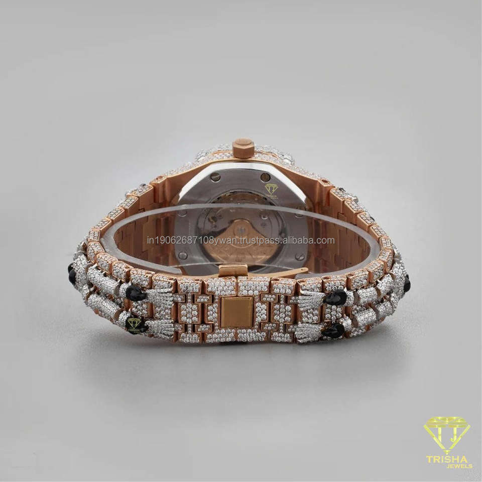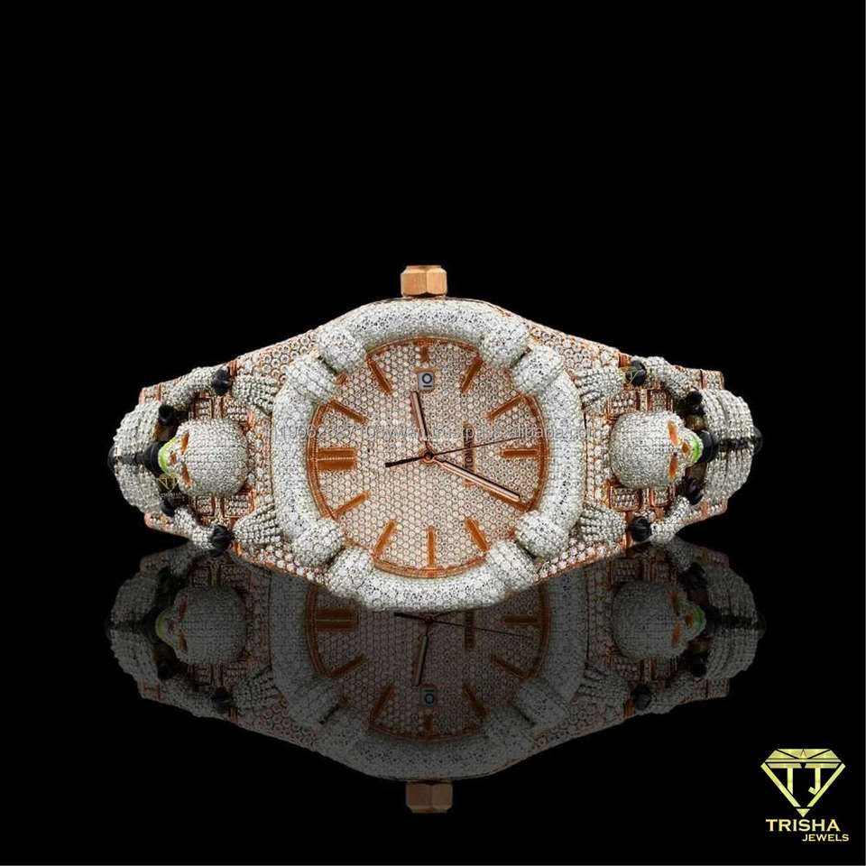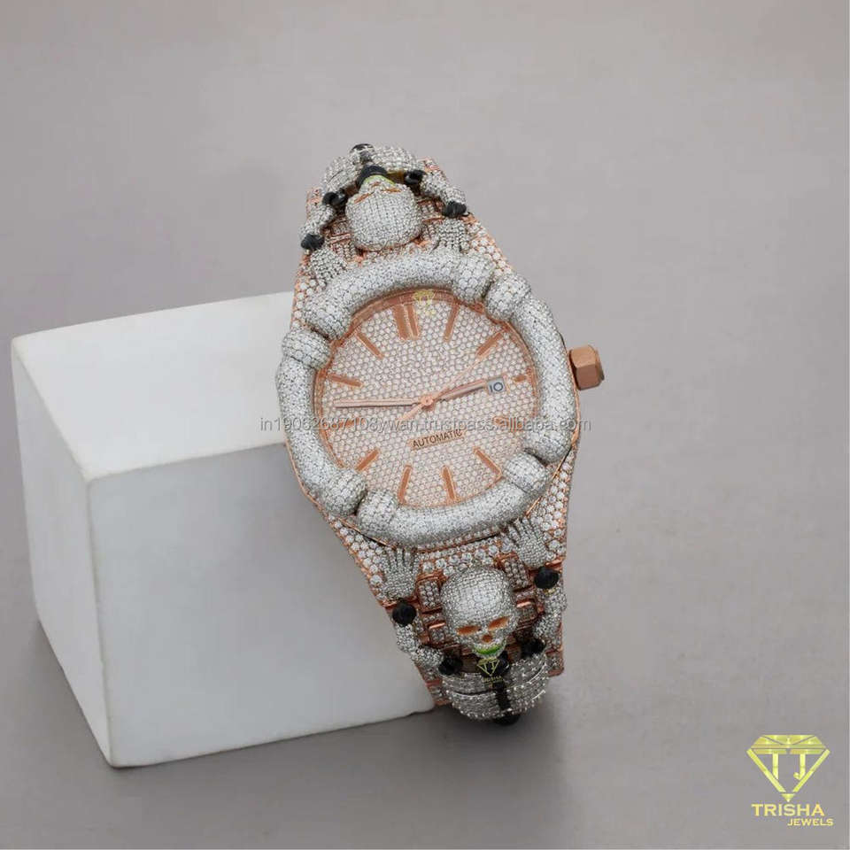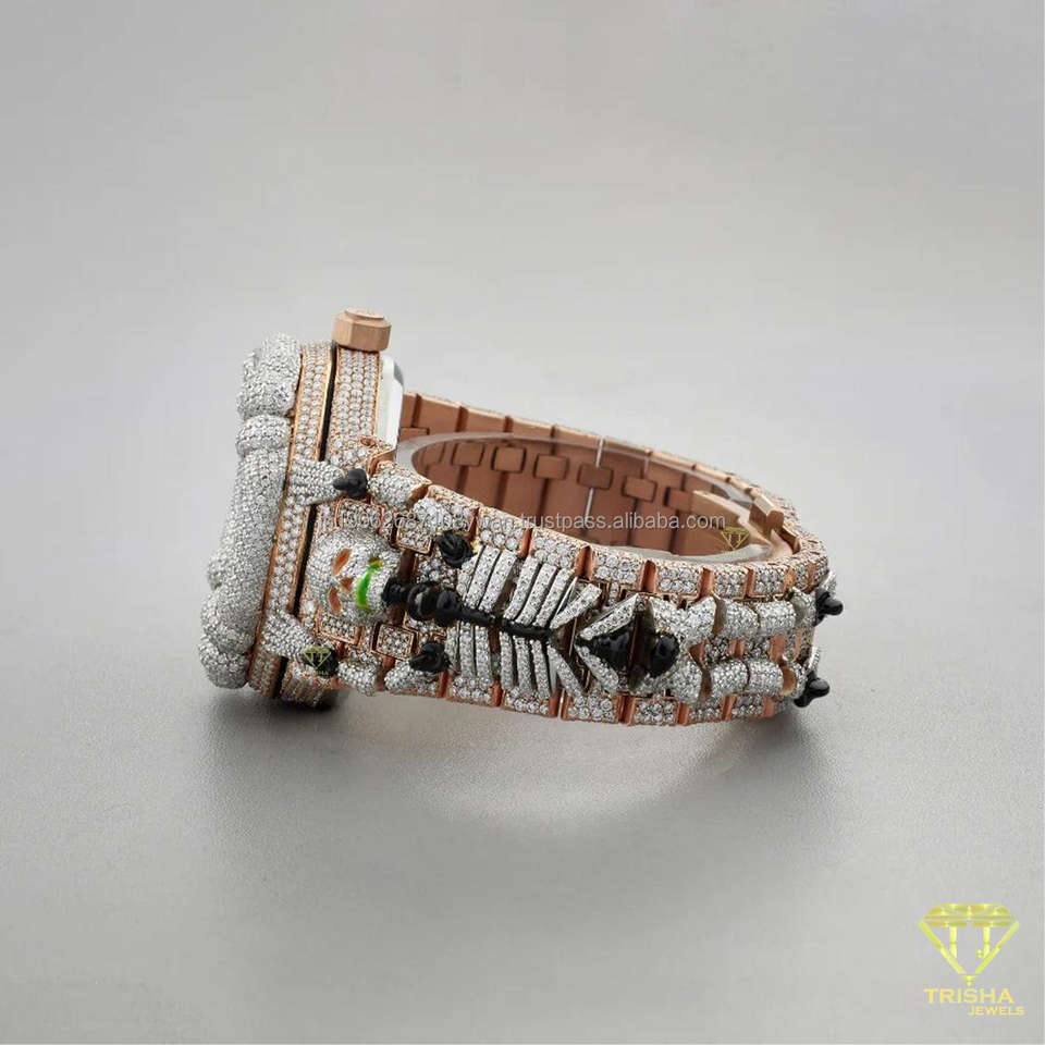 นาฬิกาข้อมือผู้ชายทรงหัวกะโหลกสุดเทรนดี้ ประดับเพชรโมอิสซาไนต์ VVS เต็มหน้าปัด ชุบทองคำชมพู และเงินแท้ 925