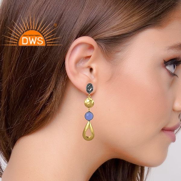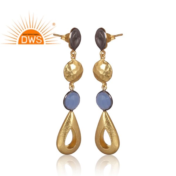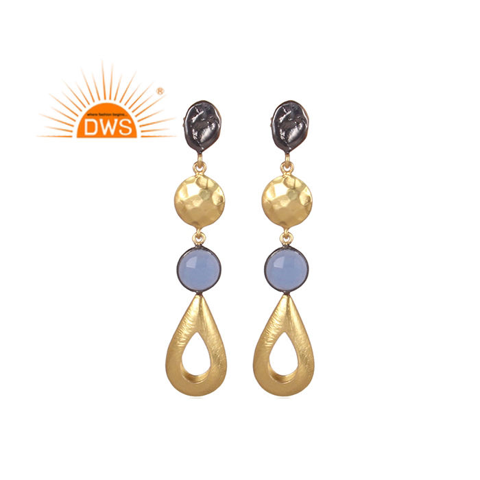 อินเทรนด์ยอดขายทองเหลืองชุบทองห้อยต่างหูแก้วสีฟ้า Chalcedony อัญมณีต่างหูแฟชั่นผู้ผลิตเครื่องประดับ