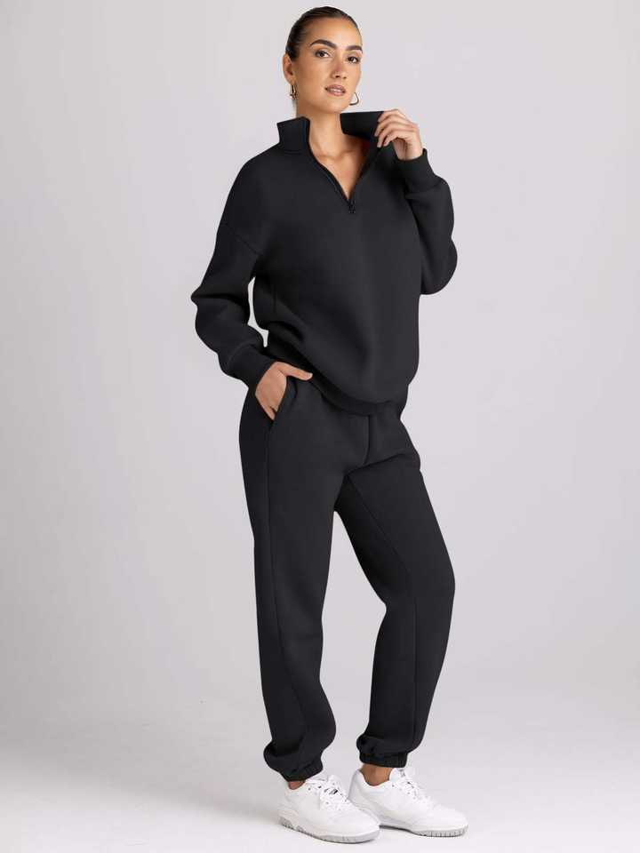 เสื้อสเวตเชิ้ตแขนยาวแบบมีซิปครึ่งตัวและกางเกงจ็อกเกอร์ผ้าฟลีซเหนือเข่า สไตล์วินเทจสีพื้นสำหรับผู้หญิง รุ่น Trendy Winter Queen เป็นมิตรกับสิ่งแวดล้อม