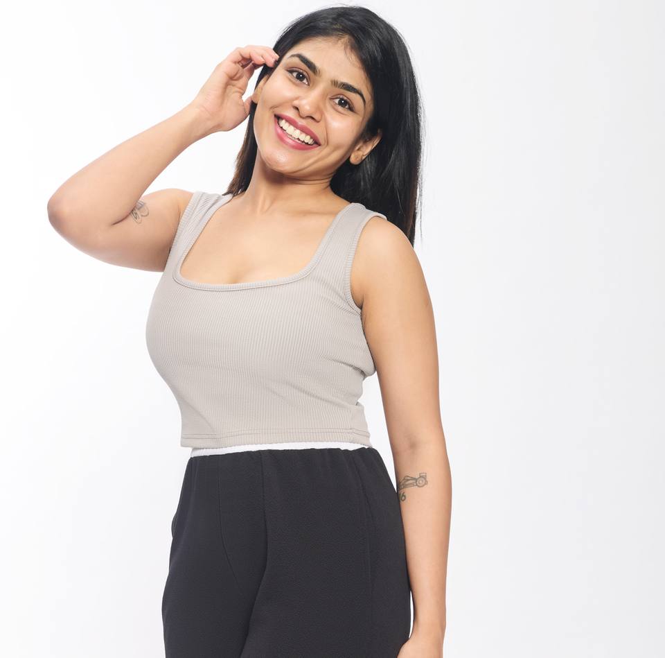 ชุดเสื้อครอปผ้าสแปนเด็กซ์คอสี่เหลี่ยมแขนกุดสำหรับผู้หญิงชุดฤดูร้อนเสื้อครอปเกรย์ทันสมัย