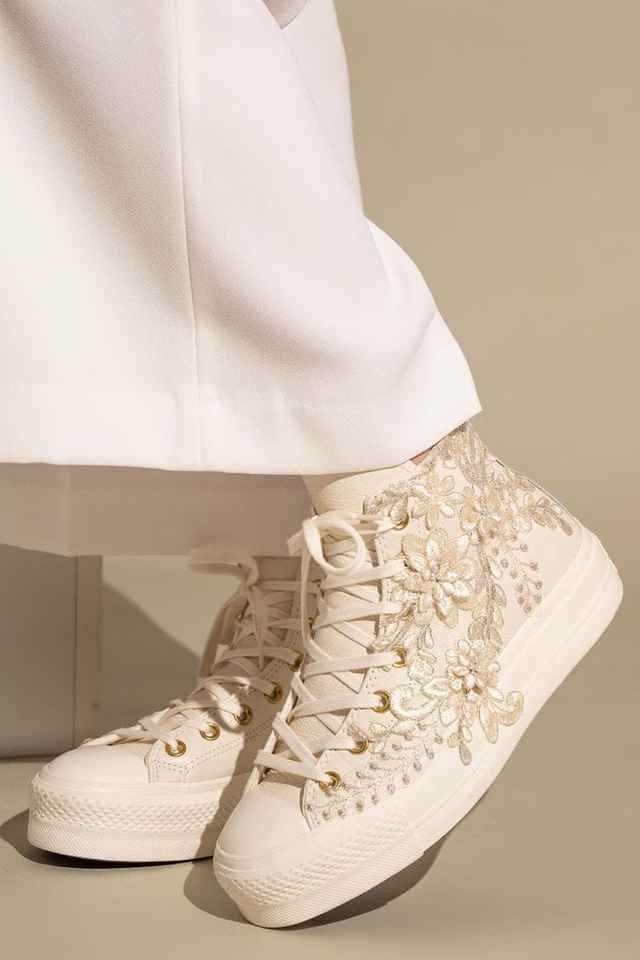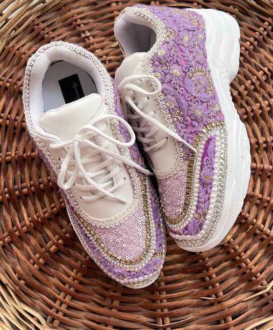 รองเท้าผ้าใบแฟชั่นผู้หญิงสีม่วงประดับเลื่อมและลูกปัด งานปักมือ รองเท้าพื้นหนา รองเท้าลำลองเดินสบาย รองเท้าสั่งทำพิเศษ