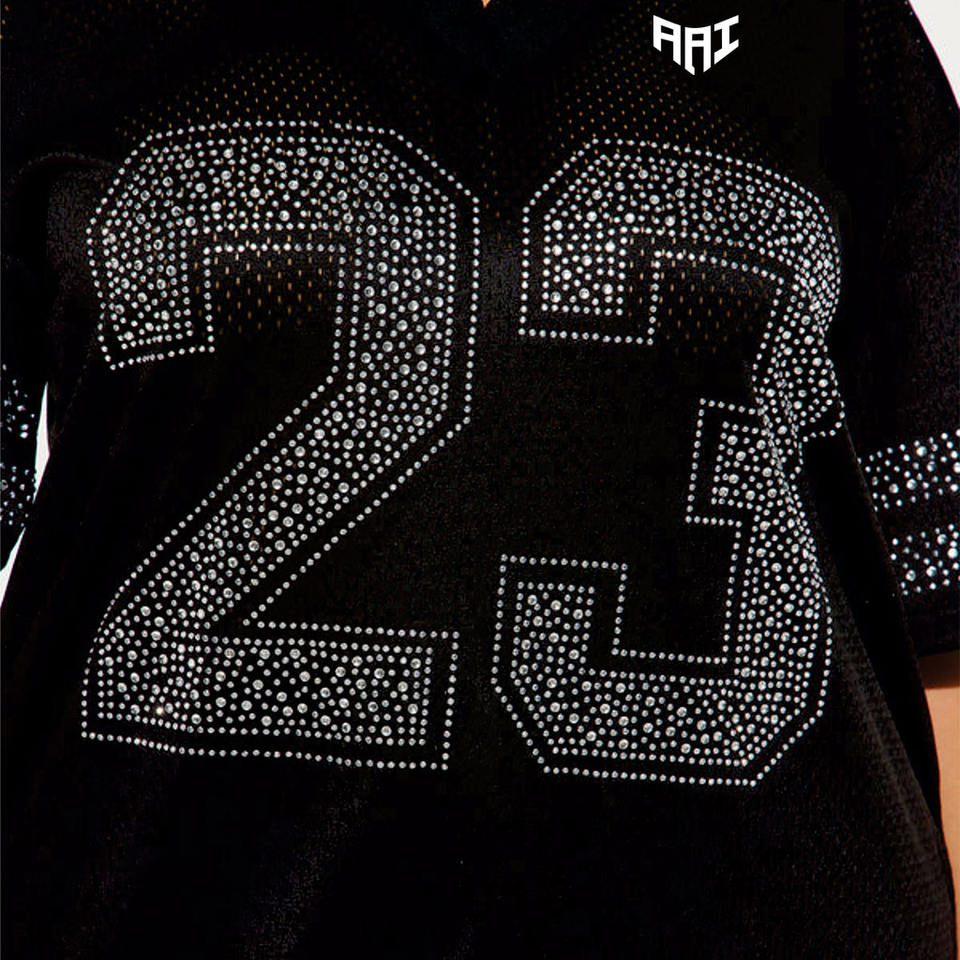 เสื้อเจอร์ซีย์อเมริกันฟุตบอลตาข่ายสีดำประดับเพชรเทียมสำหรับผู้หญิงสุดเทรนดี้ เสื้อโอเวอร์ไซส์สไตล์สตรีทแวร์ รับสั่งทำหมายเลขทีม รับผลิตเสื้อผ้าทีมแบบ OEM รับออเดอร์จำนวนมาก