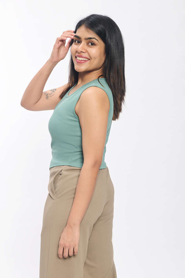 เสื้อครอปเอวลอยแขนกุดสีเทอร์ควอยซ์สำหรับผู้หญิงเสื้อสายเดี่ยวผ้าสแปนเด็กซ์ยืดหยุ่นน้ำหนักเบาสวมใส่ทุกวัน