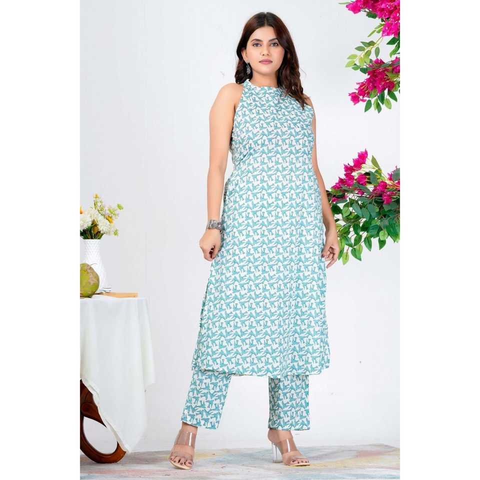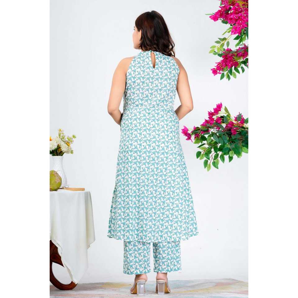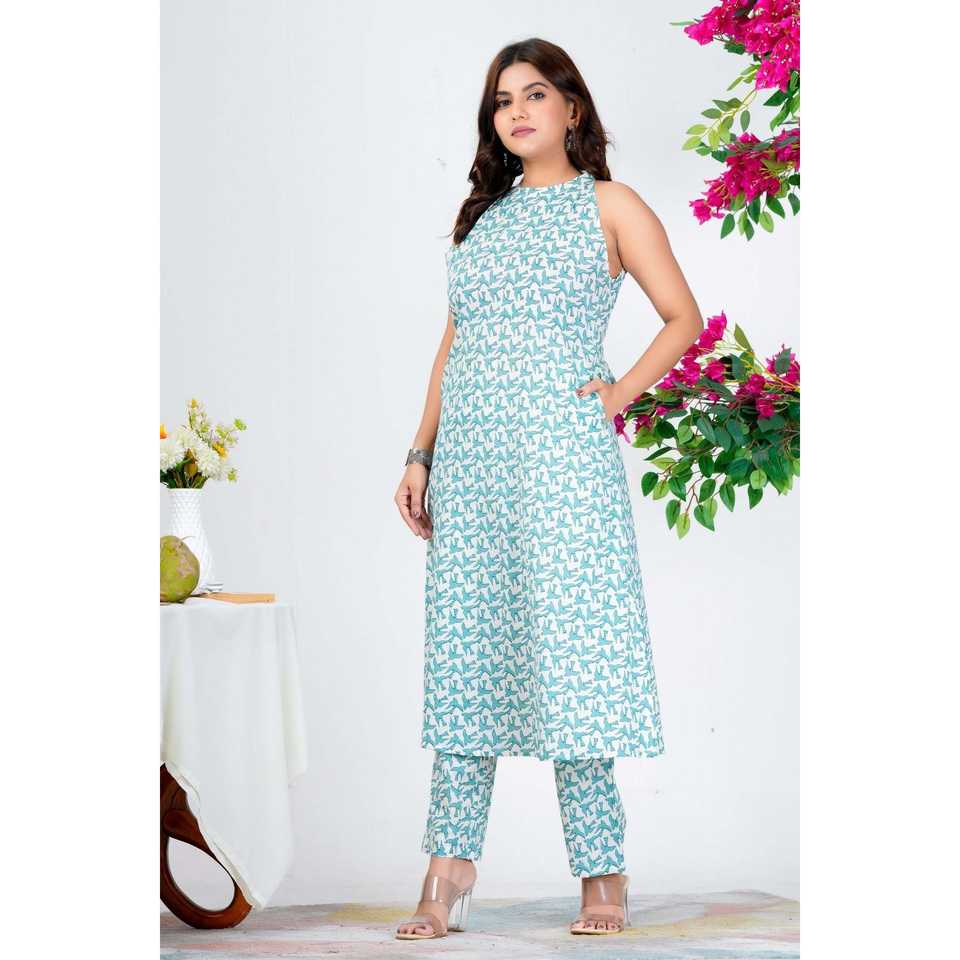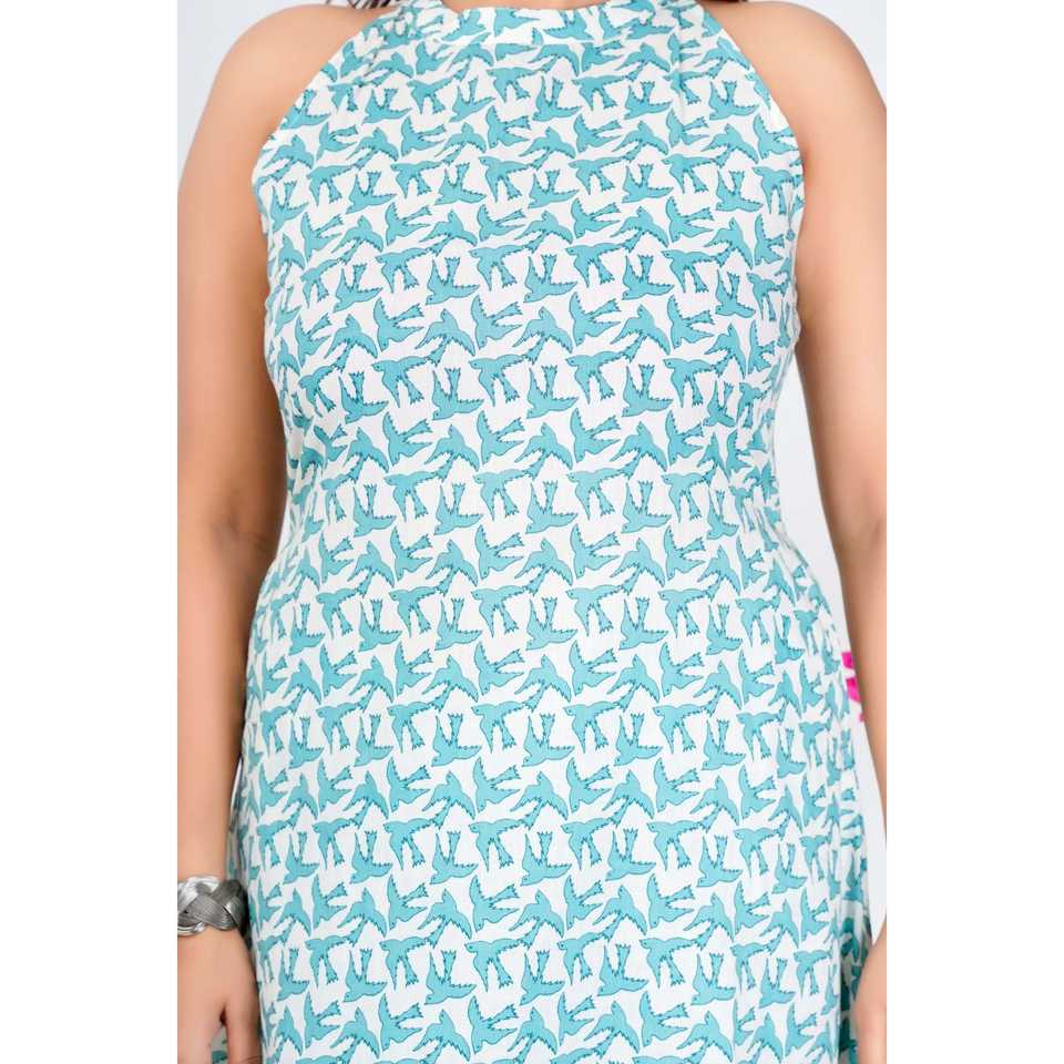 ชุดแขนกุดสีน้ำสีฟ้าของผู้หญิงอินเทรนด์พร้อมดีไซน์พิมพ์ลาย