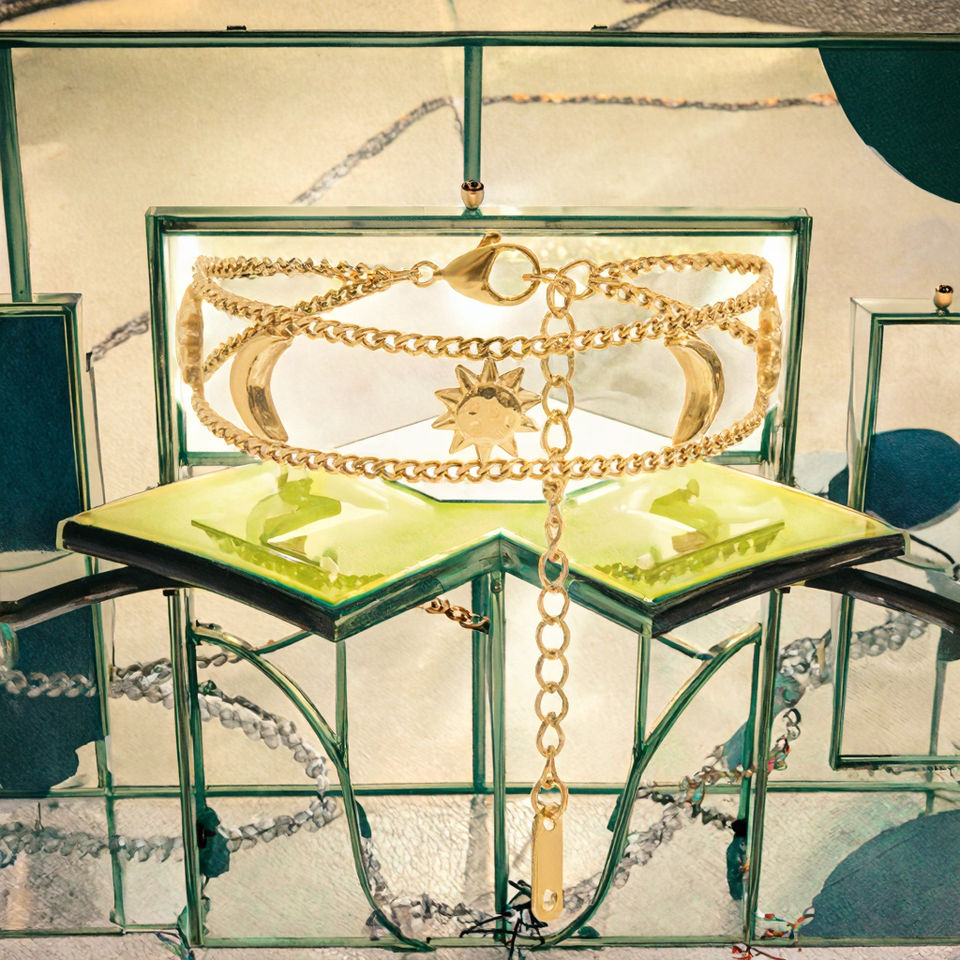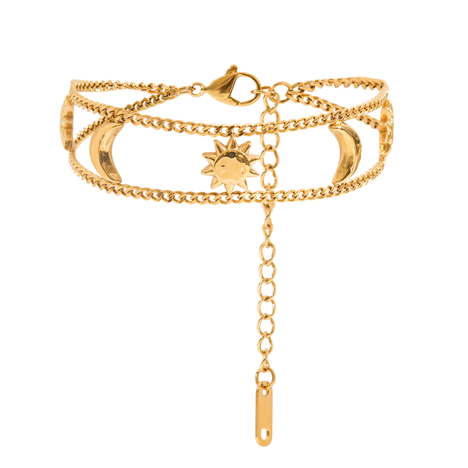 สร้อยข้อมือสแตนเลสสตีลชุบทอง 18K ดีไซน์เก๋ไก๋สำหรับผู้หญิง รุ่นคลาสสิก กันน้ำ ไม่หมอง ดีไซน์พระจันทร์สองดวง ดวงอาทิตย์หนึ่งดวง